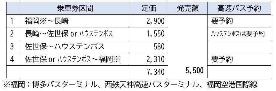 この乗車券は、福岡市内(博多・天神・福岡空港)と「長崎市中心部エリア」、「佐世保エリア」、「ハウステンボス」とを結ぶ高速バスや路線バスの乗車券4枚をセットにし、通常価格の約25%割引となる5,500円で販売する大変便利でお得なものです。