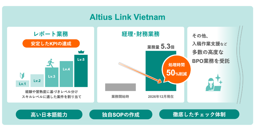 アルティウスリンク株式会社(所在地:東京都渋谷区、代表取締役社長:那谷 雅敏、以下 アルティウスリンク)は、株式会社電通オペレーション・パートナーズ(所在地:東京都港区、代表取締役社長:岩井 隆宜、以下 電通オペレーション・パートナーズ様)のバックオフィス業務において、業務処理時間50%削減と、業務標準化による品質向上を実現した好事例を公開しました。なお、本業務は当社グループ会社であるAltius Link Vietnamがベトナムにて運用を担っています。