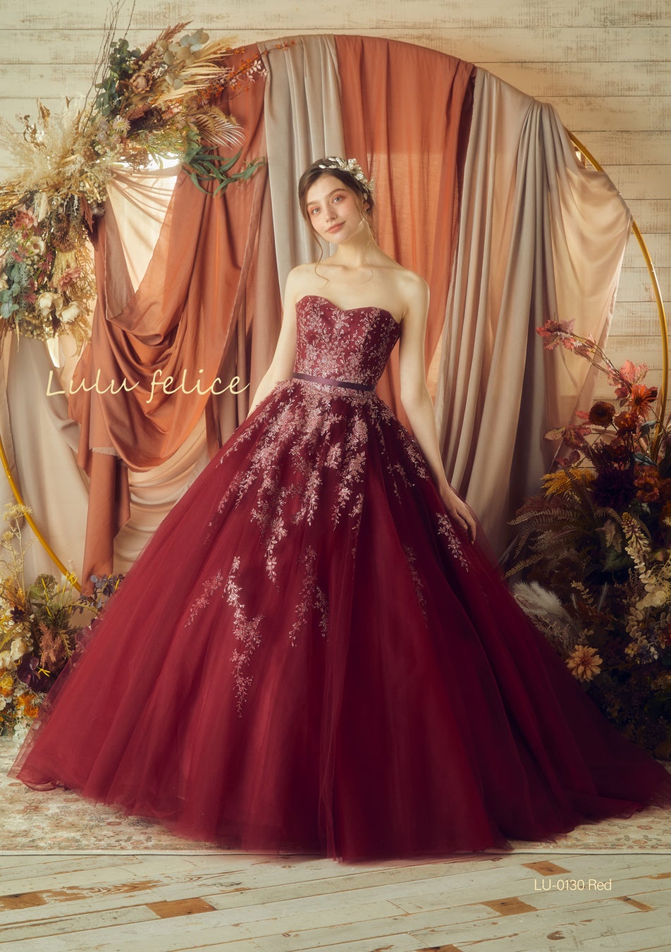 シックなレッドカラーにグリッターの輝きが魅力的。ウエストのサテンリボンは花嫁さまのお好みに合わせて、コーディネートを楽しんでいただけます。