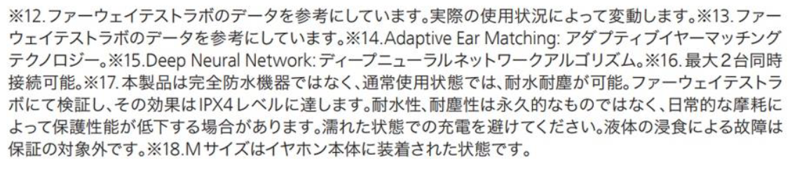 ※7 IP54の防塵・耐水性能はイヤホン本体のみに適用され、充電ケースには適用されません。本製品は、通常の環境下での防滴・防塵・耐水性能を備えています。管理された実験室の条件下でテストされ、IEC規格60529の下でIP54の認可を得ました。防滴・防塵・耐水性能は永久的なものではなく、日常的な磨耗により性能が低下することがあります。湿気の多い場所での充電は避けてください。水濡れは保証対象外です。