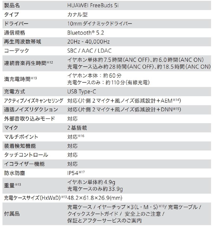 ※5 HUAWEI FreeBuds 5i の質量はHUAWEI FreeBuds 4iと比較し11%軽量となっています。 データはファーウェイラボのテスト結果によるものです。