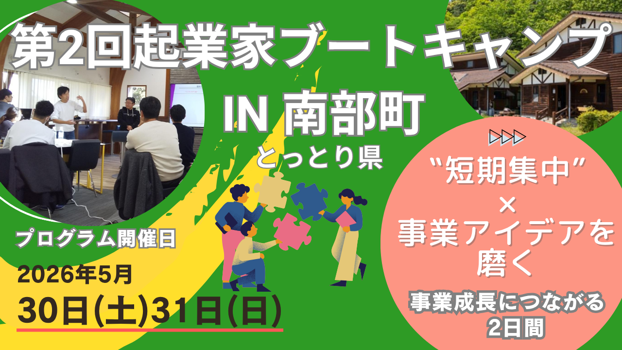株式会社AGORA(東京都町田市、代表取締役:長谷部 信樹)とGOB株式会社(東京都渋谷区、取締役Founder:山口 高弘)は、地方ビジネスに特化した実践型の宿泊プログラム『第2回起業家ブートキャンプ』を鳥取県西伯郡南部町で2026年5月30日(土)・31日(日)に開催いたします。今回で2回目を迎える同イベントは、事業開発や創業支援などを手掛ける2社が協働し専用プログラムを設計。鳥取県南部町の後援や地元企業、ローカル投資家の協力を得て、地方を盛り上げたい起業家(参加者)を実務的に支援します。