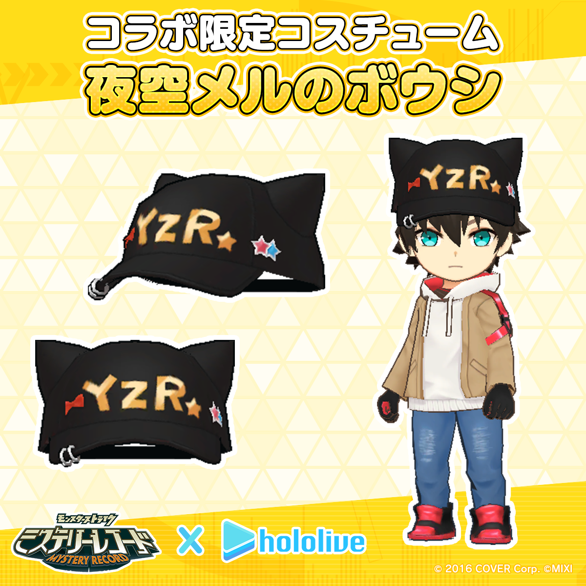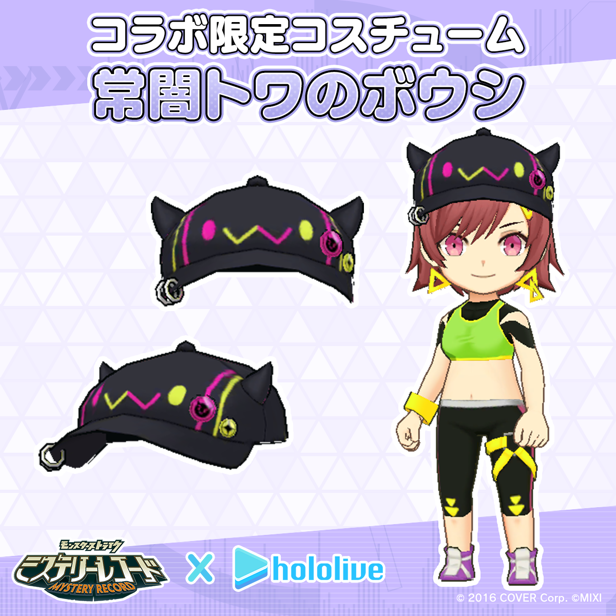 謎解き専用のコラボ限定イベントステージ「ホロライブからの挑戦状」を開催します。本イベントには、「夜空メルからの挑戦状」「大神ミオからの挑戦状」「常闇トワからの挑戦状」の3種類のソロ専用ステージがあり、「夜空メル」「大神ミオ」「常闇トワ」の3名に関する謎解きが出題されます。ステージにはモードが2種類あり、HARDをクリアすると「夜空メルのボウシ」「大神ミオのカチューシャ」「常闇トワのボウシ」などコラボメンバー3名を模した頭装備衣装が報酬としてもらえます。