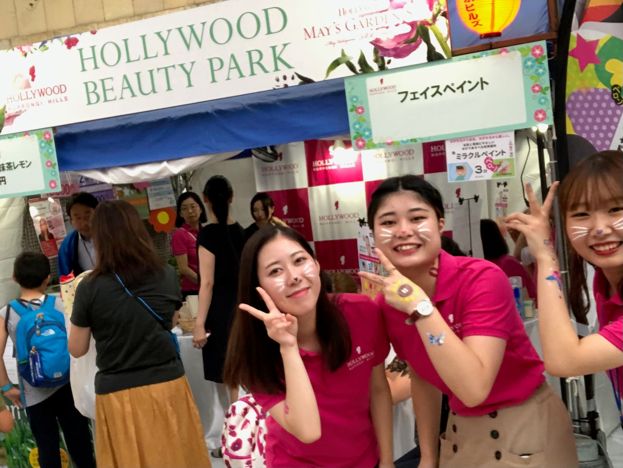 夏のお祭りならではの雰囲気満載の中、ハリウッドブースでは人気のフェイスペイント+光るブレスレット(300円税込)の他、ハリウッド化粧品公式LINEにその場でお友達登録して頂いた方には、話題の化粧品サンプルやソイプロテインをプレゼントいたします。六本木ヒルズ内にあるBEAUTY CELLAR でそのまま利用できる福引券付きです。(数量限定、なくなり次第終了)