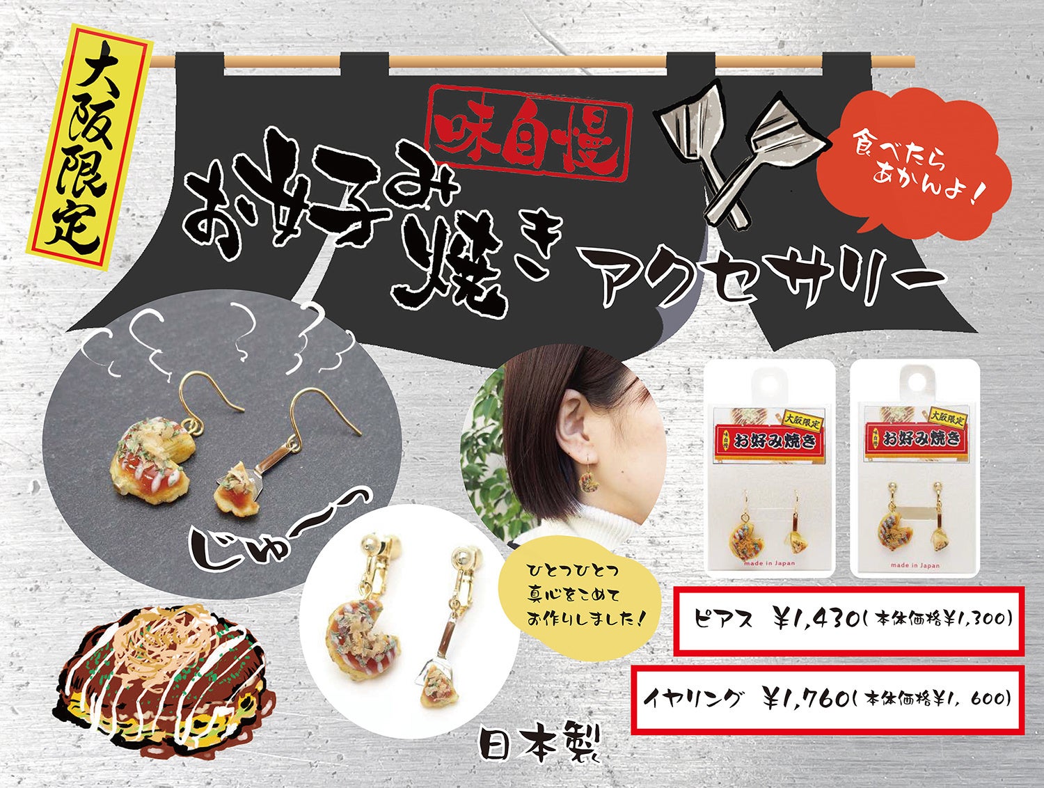 食べたらあかんよ!大阪土産アクセサリー「お好み焼きピアス」「お好み焼きイヤリング」新発売