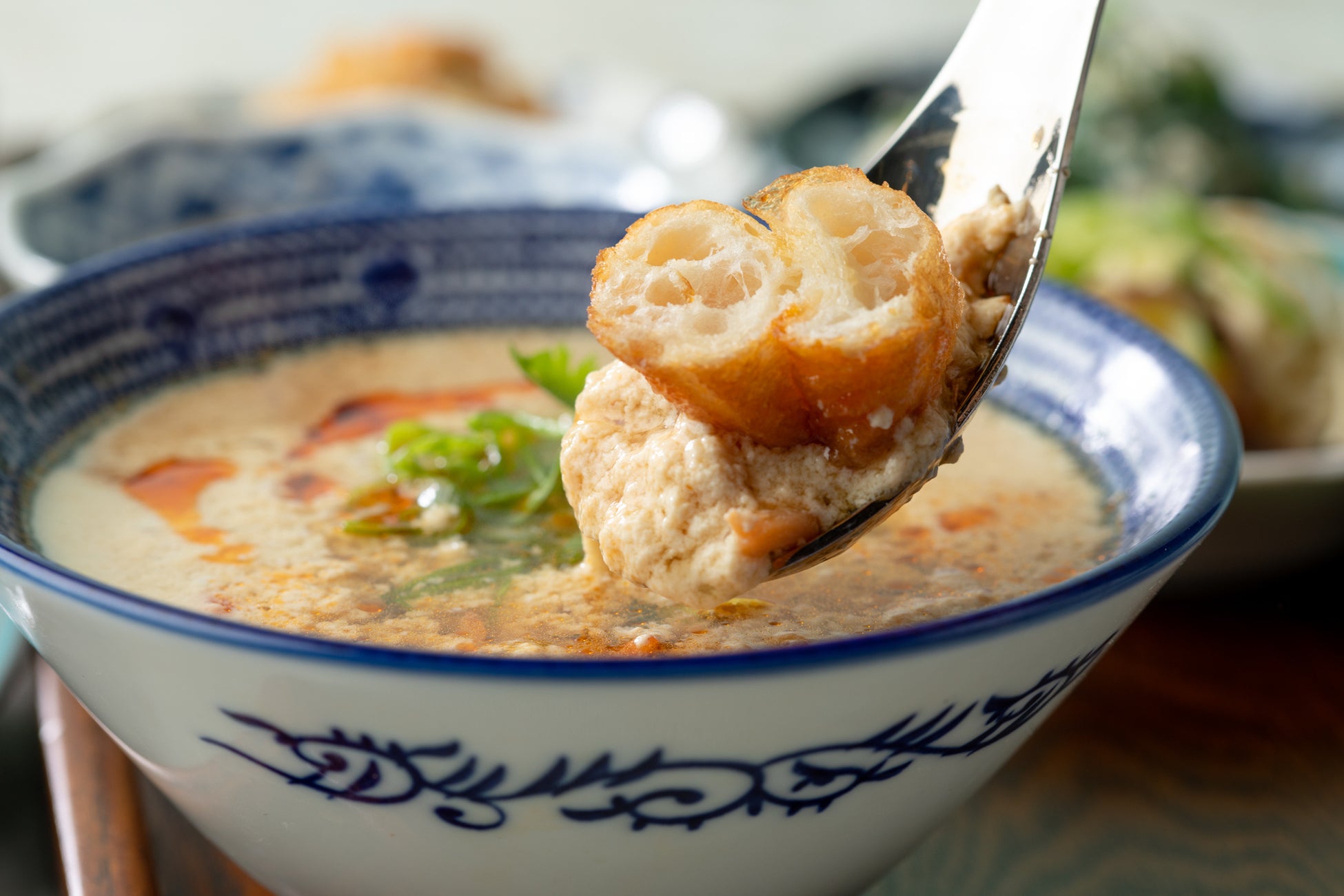 鹹豆漿(シェントウジャン)。 熱い豆漿(豆乳)に醤油、黒酢、ラー油などを加えていただくスープです。張記の鹹豆漿(シェントウジャン)は干しエビやザーサイを入れてアクセントになっていてとても美味しいです。一つ一つ丁寧に焼き上げ、とろけるような食感の自家製大根餅はお店でも即完売の人気商品です。