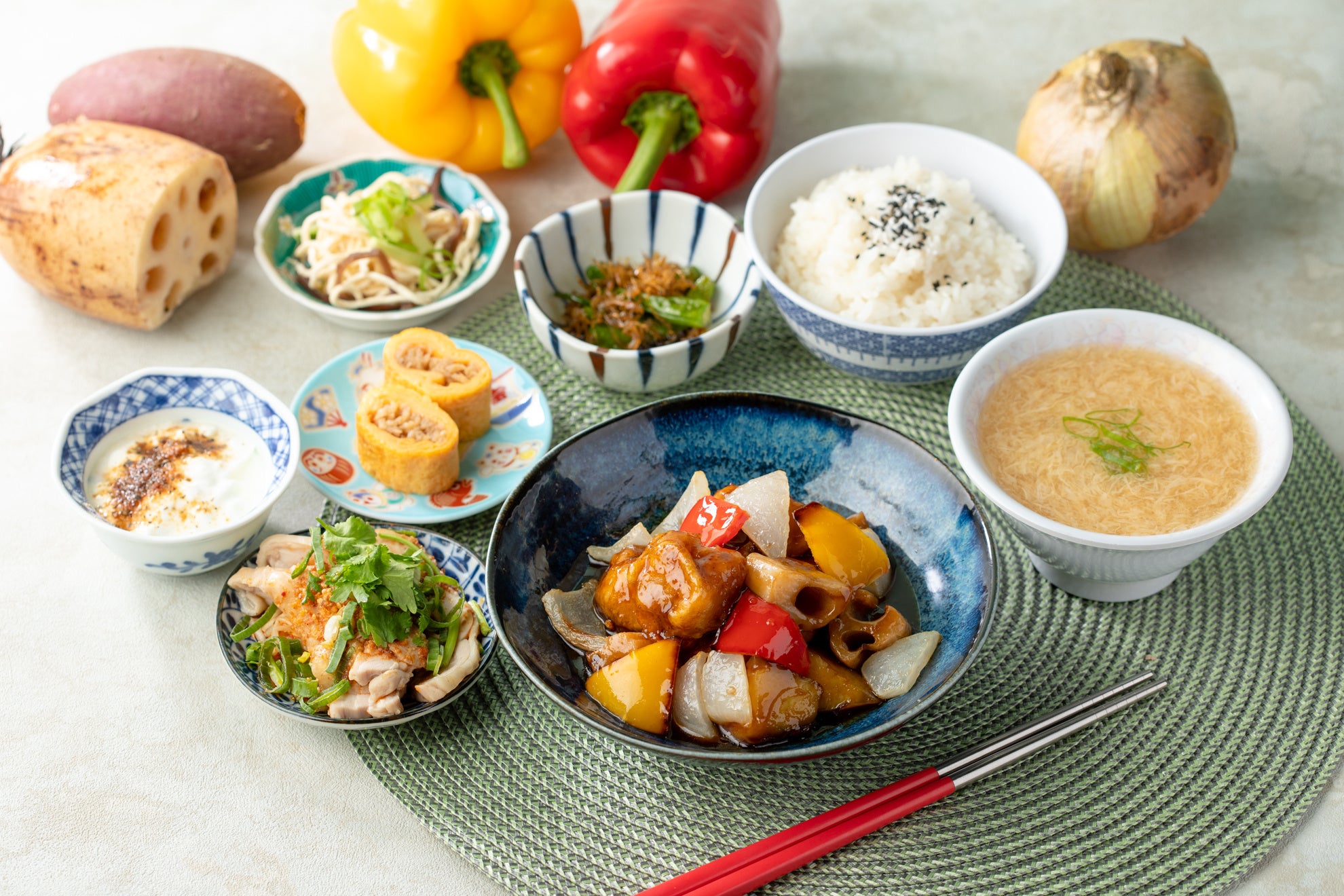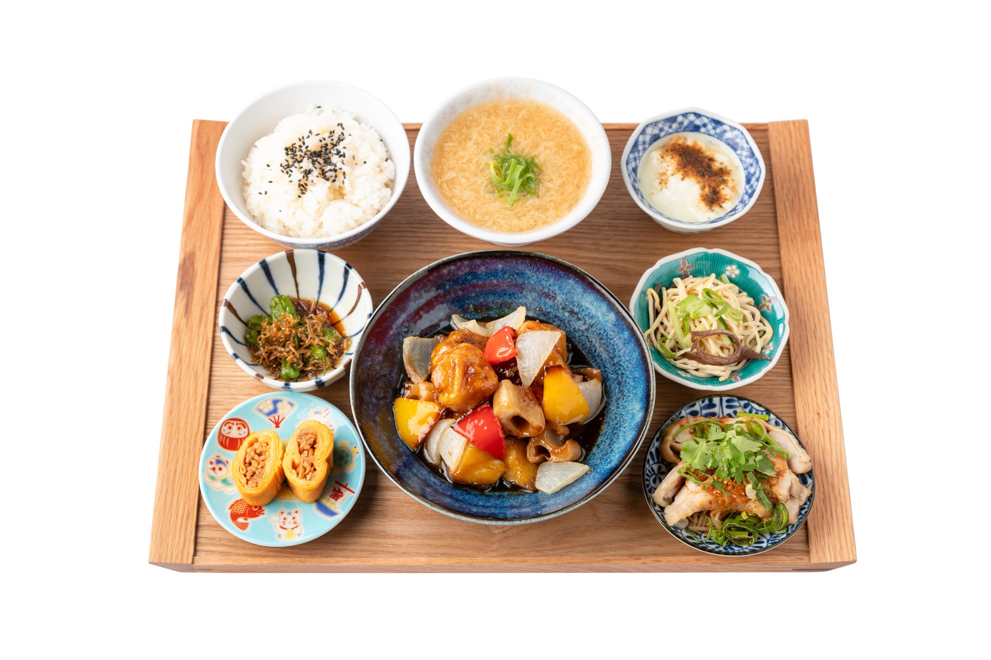 ① たっぷり野菜と台湾黒酢豚の健康美食ランチ全8品(1,180円税込み)