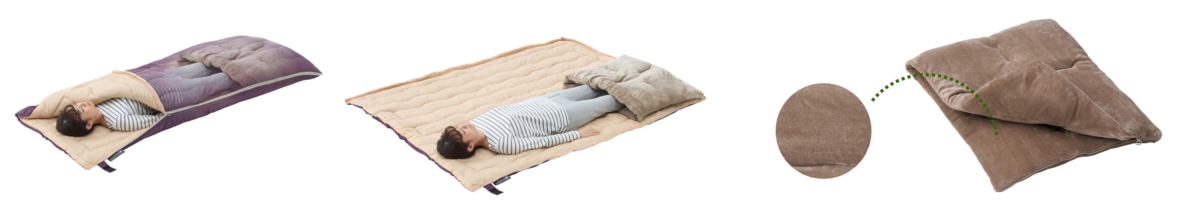 表面、肌面にはポリエステル系素材に毛足の長い起毛を施した「やわらかフランネル」を使用しており、心地よい肌触りと温かさを両立しました。さらに中綿には、ポリエステル繊維がマカロニの様な中空の形状で繊維の中に空気を蓄えられる「ダイナチューブファイバー」を採用することで、保温性の向上と軽量化も実現しました。また、洗濯機で丸洗いできるのでいつでも清潔に保つことができます。