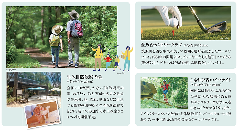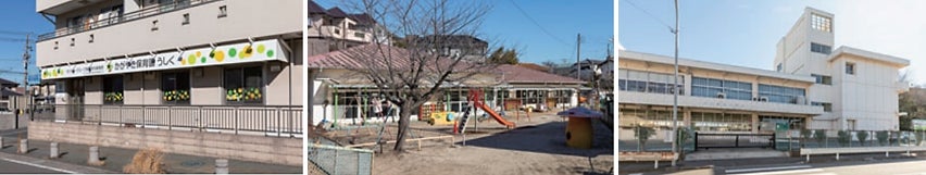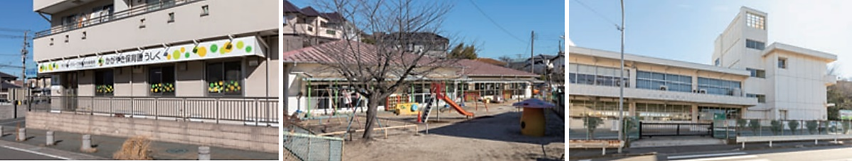 左から、かがやき保育園うしく(徒歩1分)/つつじが丘保育園(徒歩5分)/牛久第二小学校(徒歩14分)