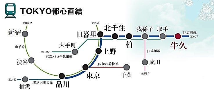 ※「牛久」駅より「東京」駅66分(59分)・「品川」駅76分(69分)JR常磐線利用、「上野」駅でJR上野東京ラインに乗り換え。日中平常時はJR常磐線(上野東京ライン)直通。「柏」駅直通24分(22分)・「北千住」駅直通42分(39分)・「上野」駅直通55分(51分)JR常磐線利用。日中平常時も同じ。※掲載の所要時間は通勤時、( )内は日中平常時のもので時間帯により異なります。また乗り換え・待ち時間を含みます。「駅すぱあと」調べ。(2024年1月時点)