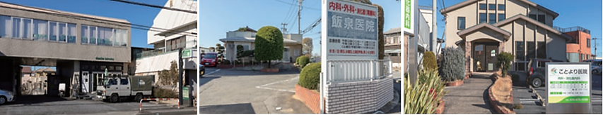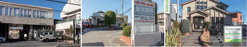 左から、ときわ歯科医院(徒歩3分)/飯泉医院(徒歩3分)/ことより医院(徒歩3分)