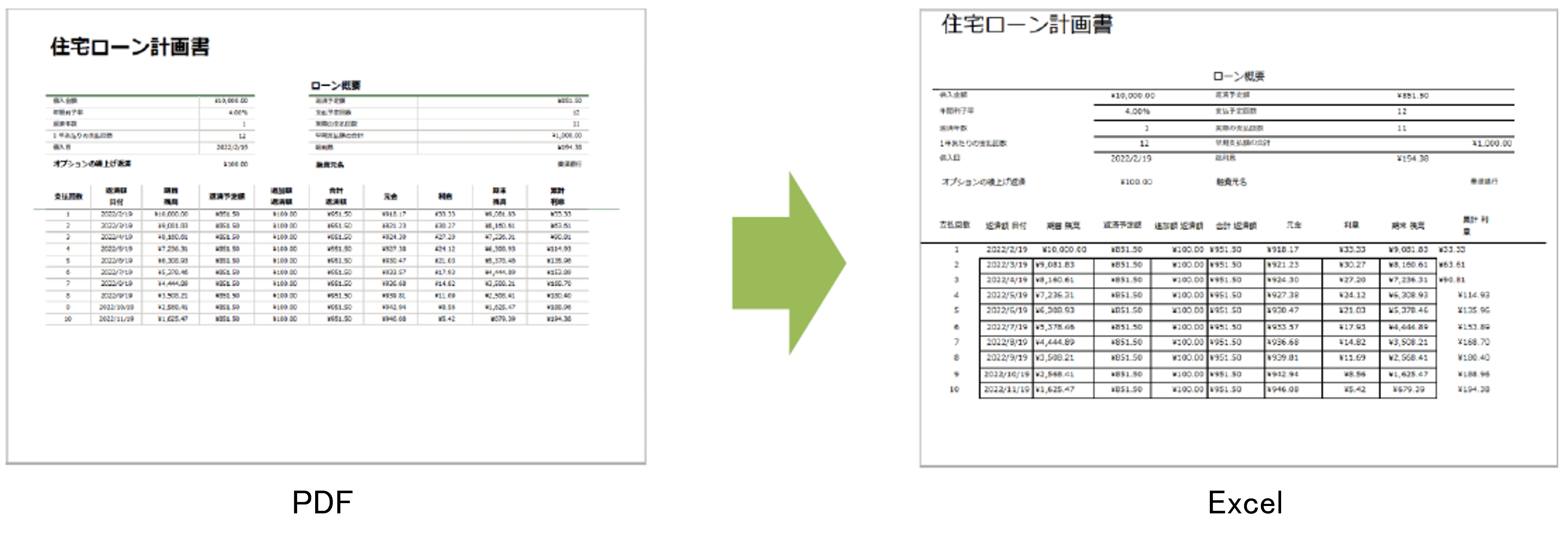 元のレイアウトを保持したまま変換でき、表組みがExcelではセルに再現します。