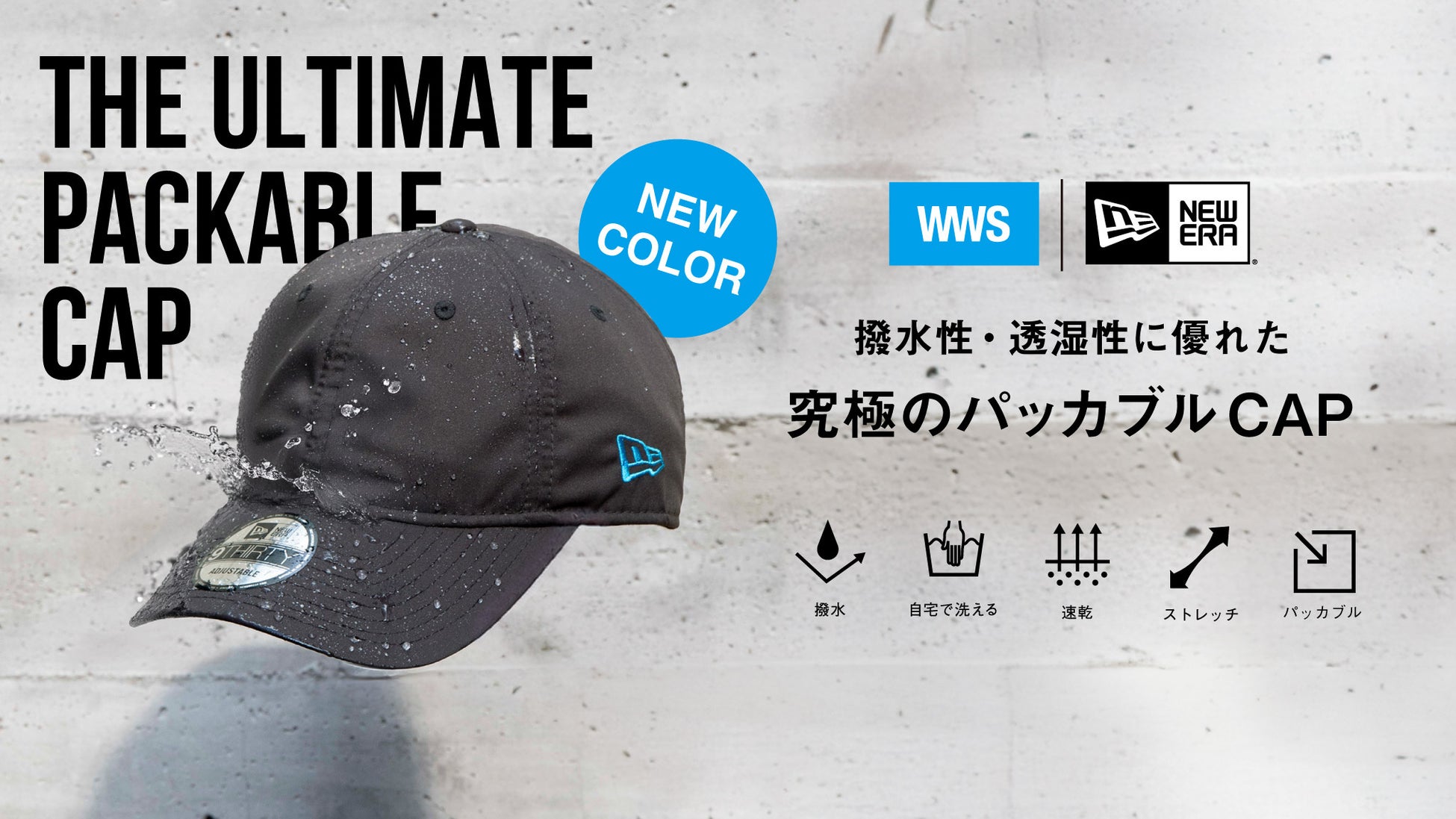 特徴:柔らかな被り心地のベーシックなベースボールキャップにはWWS独自開発の新素材「ultimex」を使用し、撥水性と速乾性に優れた高機能性を実現。簡単に丸洗いでき、汗染みや汚れもすぐ落とせるので普段使いだけでなくアウトドアシーンやスポーツの際にもおすすめです。バイザーに柔軟かつ弾力性のあるEVA素材を採用することにより、折りたたんで鞄やポケットに収納することができます。ニューエラのロゴにはWWSのロゴカラーと同じシアンを採用。