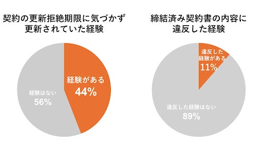 契約は締結して初めて効力が発生し、契約の効力が失われない限り、その契約で定められた義務を遵守しなければなりません。しかし契約内容を把握していないことで、不要になった契約が更新され続けたり、知らぬ間に契約義務違反を犯したりする可能性があります。実際に当社が行った調査では、契約の更新拒絶期限に気づかず契約が自動更新されていた経験があると答えた方が44%(図1)、締結済み契約書の内容に違反した経験があると答えた方が11%(図2)に上るなど、コントラクトマネジメント(契約管理)体制が十分でないことで、不要な契約更新や契約違反といった問題が起きています。