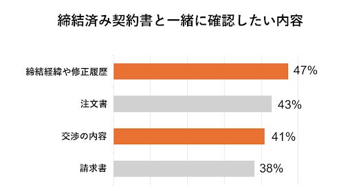 また、これまでの契約書管理サービスや体制では、締結済みの契約書を保管・管理することが一般的で、締結に至る経緯や参考資料などの関連情報を紐づけて保管することが難しいため、ナレッジマネジメント体制が構築できないという課題がありました。実際に当社が行った調査では、約95%の方が過去の契約書を見返したいタイミングがあると答え、そのうち契約書とあわせて確認したいものとして、締結経緯や修正履歴(47%)、注文書(43%)、交渉経緯(41%)などが挙がり(図3)、関連情報も確認したいという強いニーズが明らかになりました。