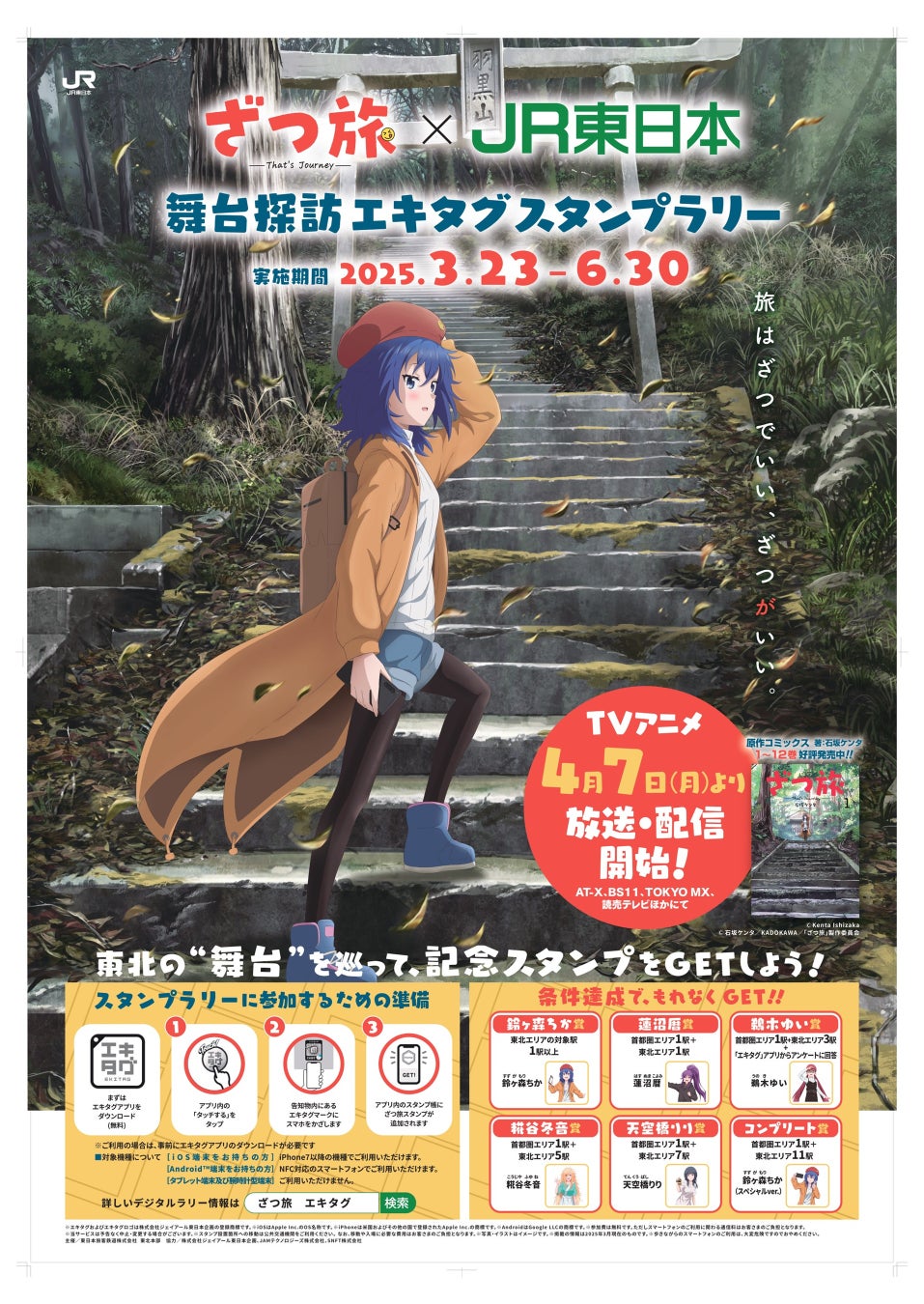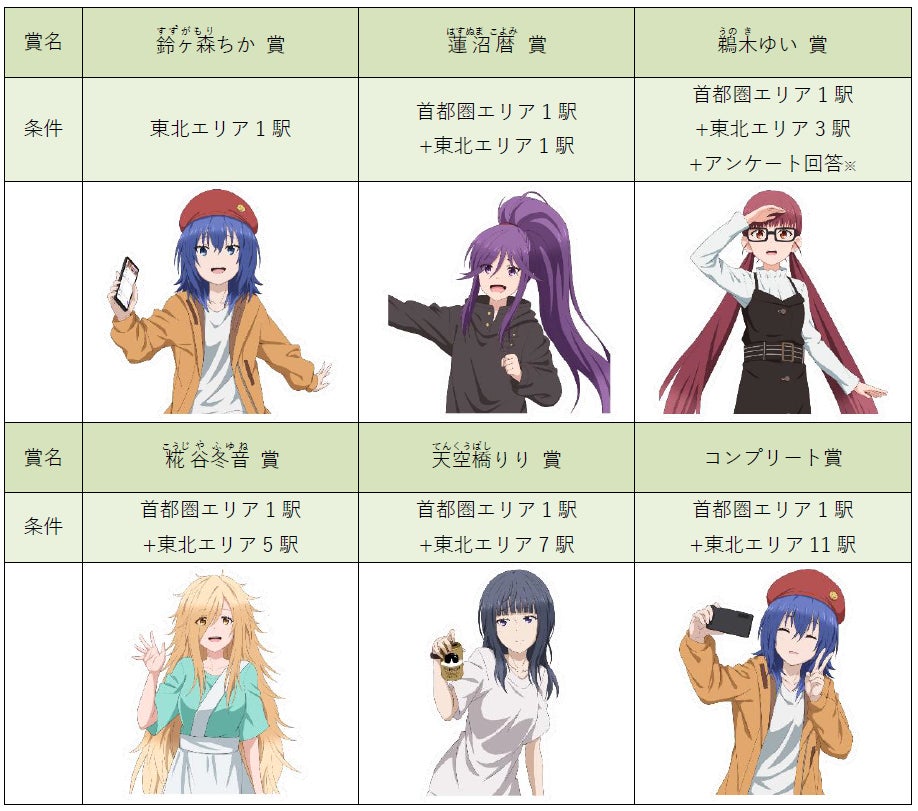 ◎「ざつ旅-That's Journey-」の漫画やアニメで実際に舞台となった東北エリア11駅と首都圏エリア3駅の全14駅でオリジナル駅スタンプをゲットでき、条件を達成すると記念スタンプとしてTVアニメ「ざつ旅-That's Journey-」に登場するキャラクターのデジタルスタンプをプレゼントします。