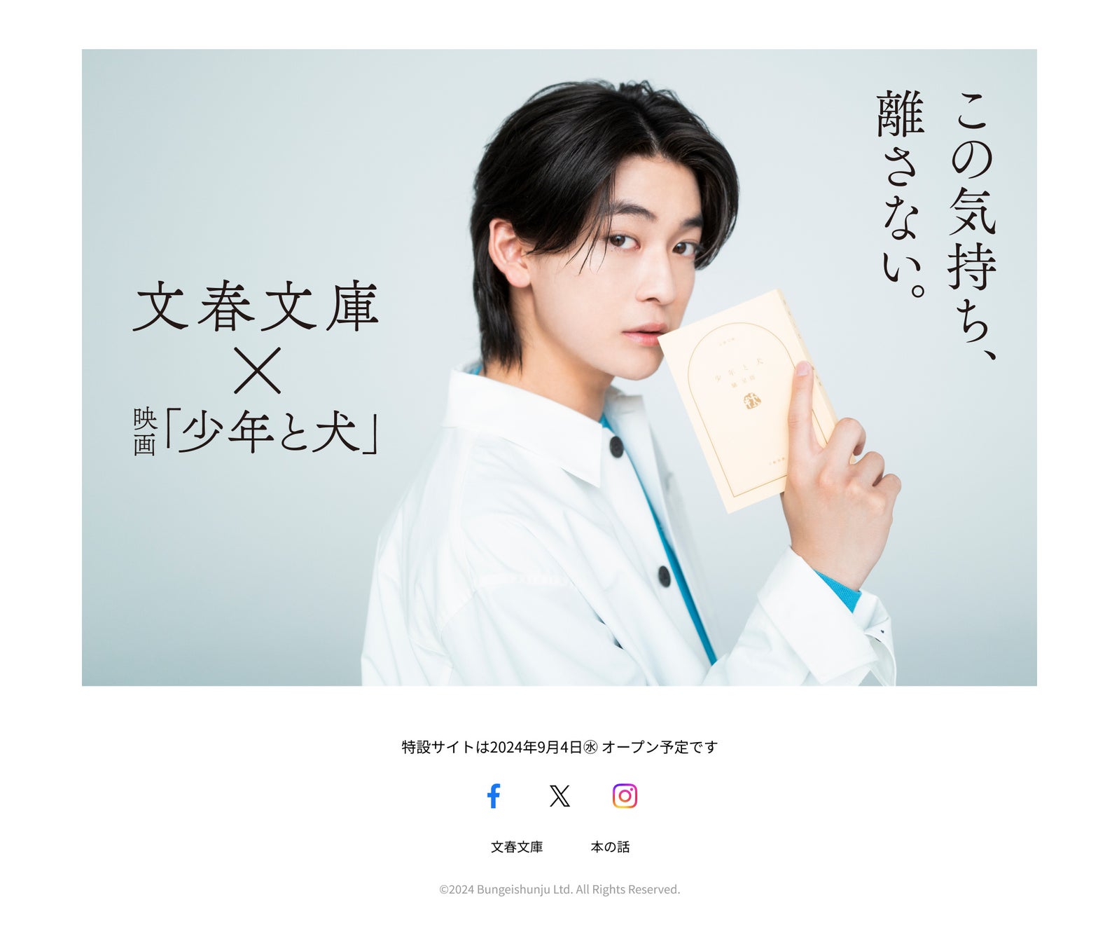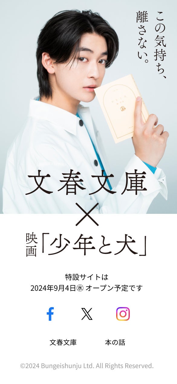 「秋100ベストセレクション」は読書の秋にあわせて、文春文庫のラインナップからおすすめの銘柄をピックアップして例年行っている文庫フェアです。今年は、映画『少年と犬』とコラボ。“この気持ち、離さない。”というコンセプトのもと、イメージキャラクター高橋文哉さん×写真家・澁谷征司さんによるビジュアルを展開。特設サイトの本オープンは9月4日(水)ですが、一足早く本日より、今年のティザーサイトにてビジュアルを1カットご覧いただけます。