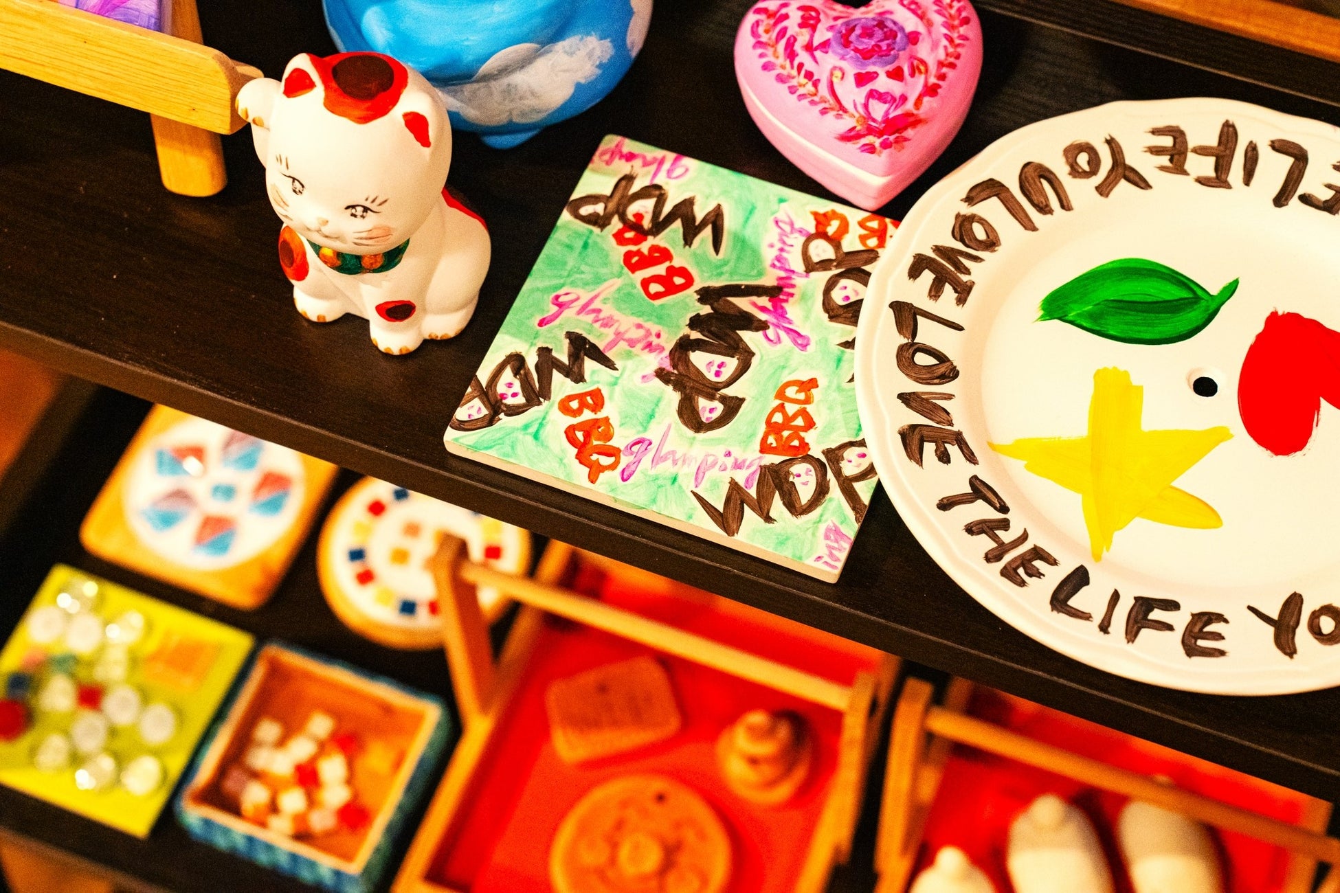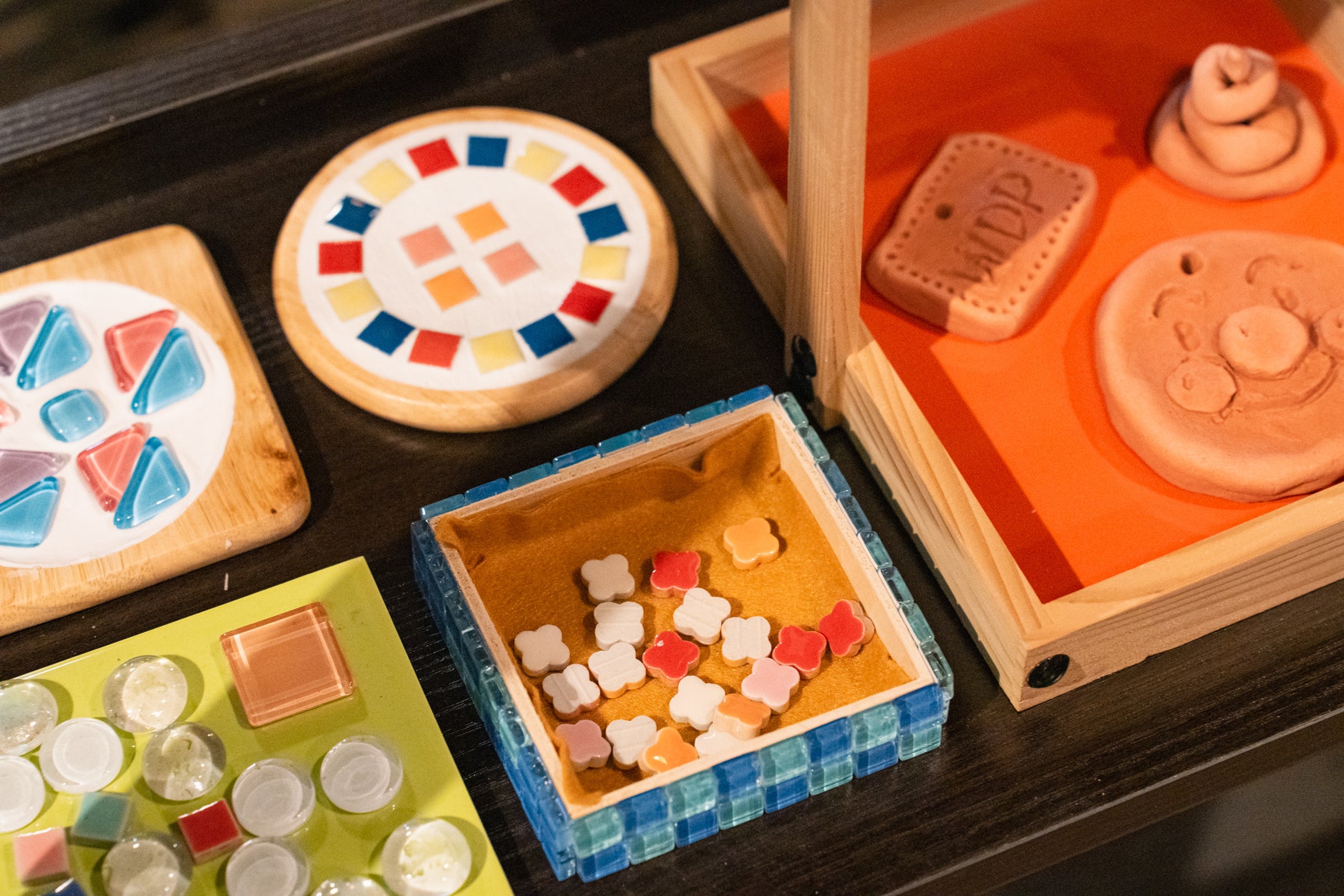 【かやぶき工房】では、陶器の街として知られる愛知県瀬戸市の文化を感じられる陶器の絵付けや粘土細工をご用意しております。小さなお子様でも気軽にモノづくりが出来るようなウッドタイルや、ルームプレートお絵描き体験、オリジナルの缶バッジ作りや様々な体験がお待ちしております。