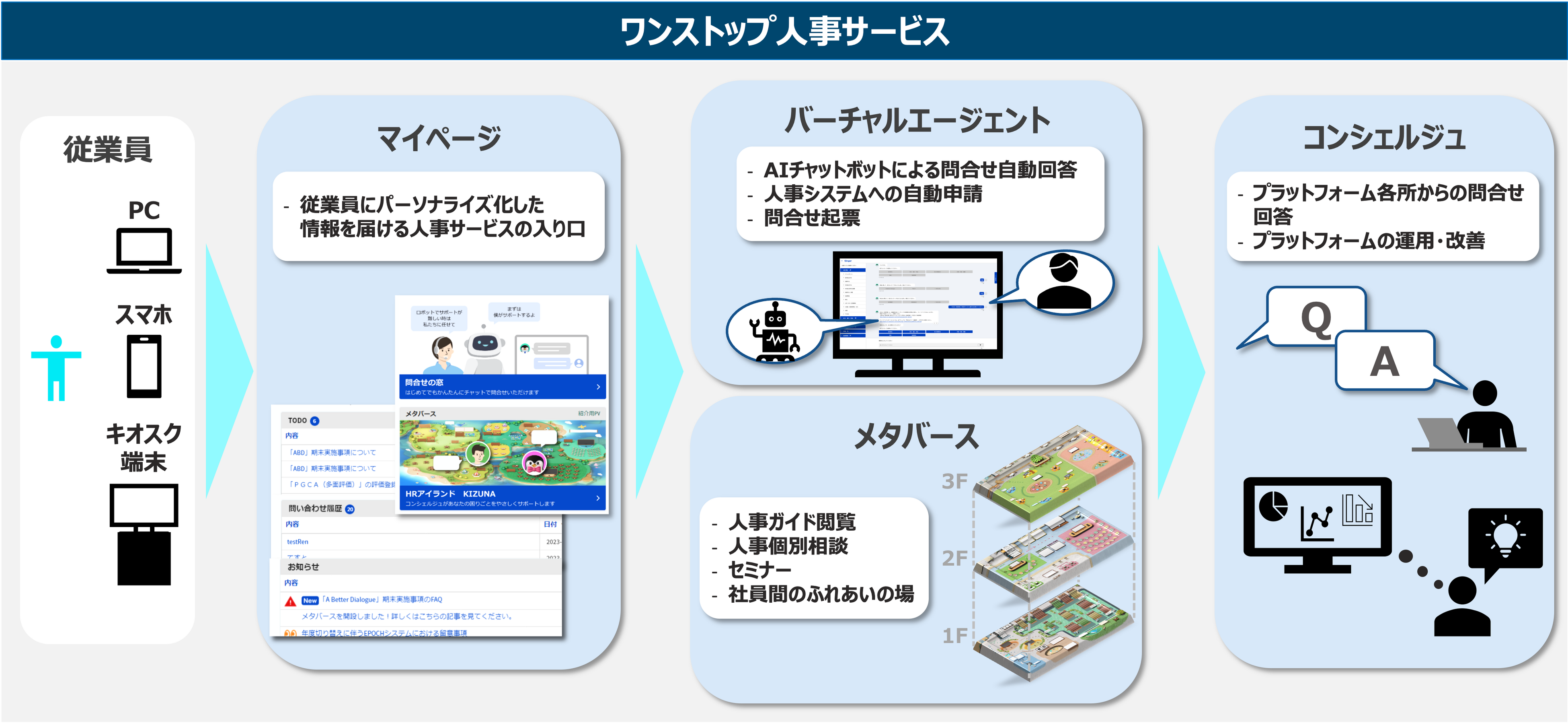 今回体制を拡充した「ワンストップ人事サービス」は、従業員接点をワンストップ化した「テクノロジーと人の温かみある人事サービス」を目指し、人事情報や問合せへの入口を集約し、お知らせやTo Doをパーソナライズ化して提供する「マイページ」、AIチャットボットによる自動回答や自動申請を可能とする「バーチャルエージェント」、従来のFace to Faceでの対応ならではの安心感や温かみのあるサービスを新たな形で実現している「メタバース」、さらに、これらで解決できない複雑な問合せに人事担当者が直接対応する「コンシェルジュ」から構成されています。