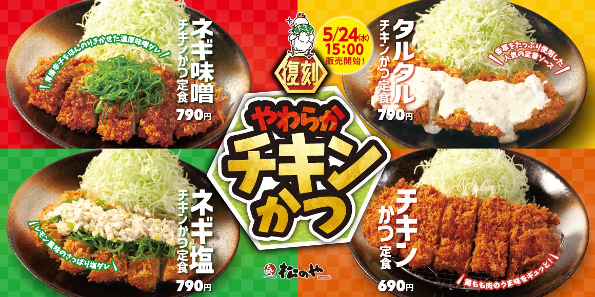 商品名 チキンかつ定食 690円 ネギ味噌チキンかつ定食 790円 タルタルチキンかつ定食 790円 ネギ塩チキンかつ定食 790円 ※全て税込価格です。また、店内・お持ち帰りの税込価格は同一です。 ※お持ち帰りいただけます。お持ち帰りのみそ汁は、別途60円でお買い求めいただけます。 発売日 2023年5月24日(水)午後3時 ~ 対象店舗 一部店舗を除く全国の松のや・松乃家 高速PA店舗では、販売いたしません。 |