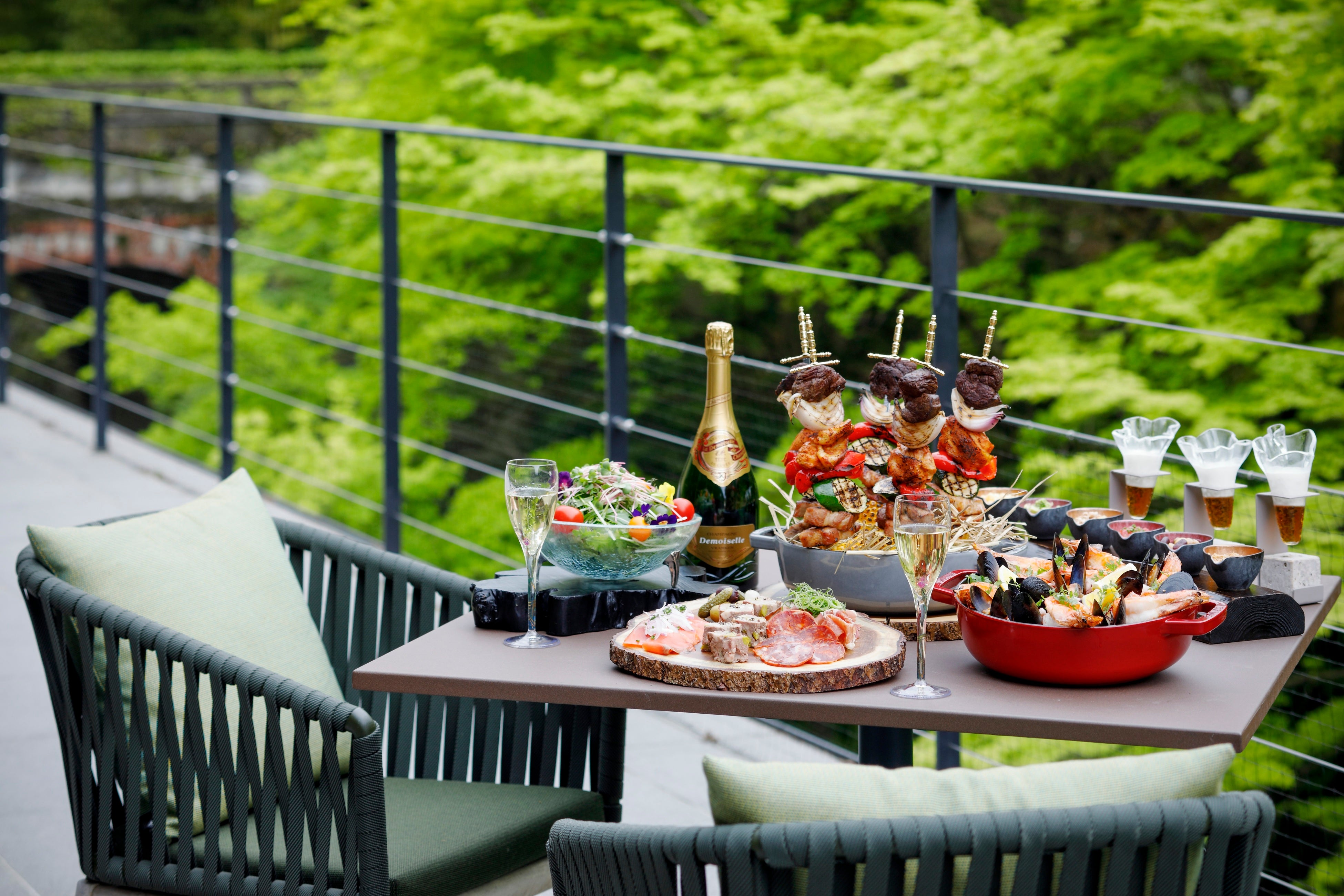 緑豊かな自然に包まれたテラス席でシャンパンと地中海スタイルのグリル料理を味わう夕涼み
