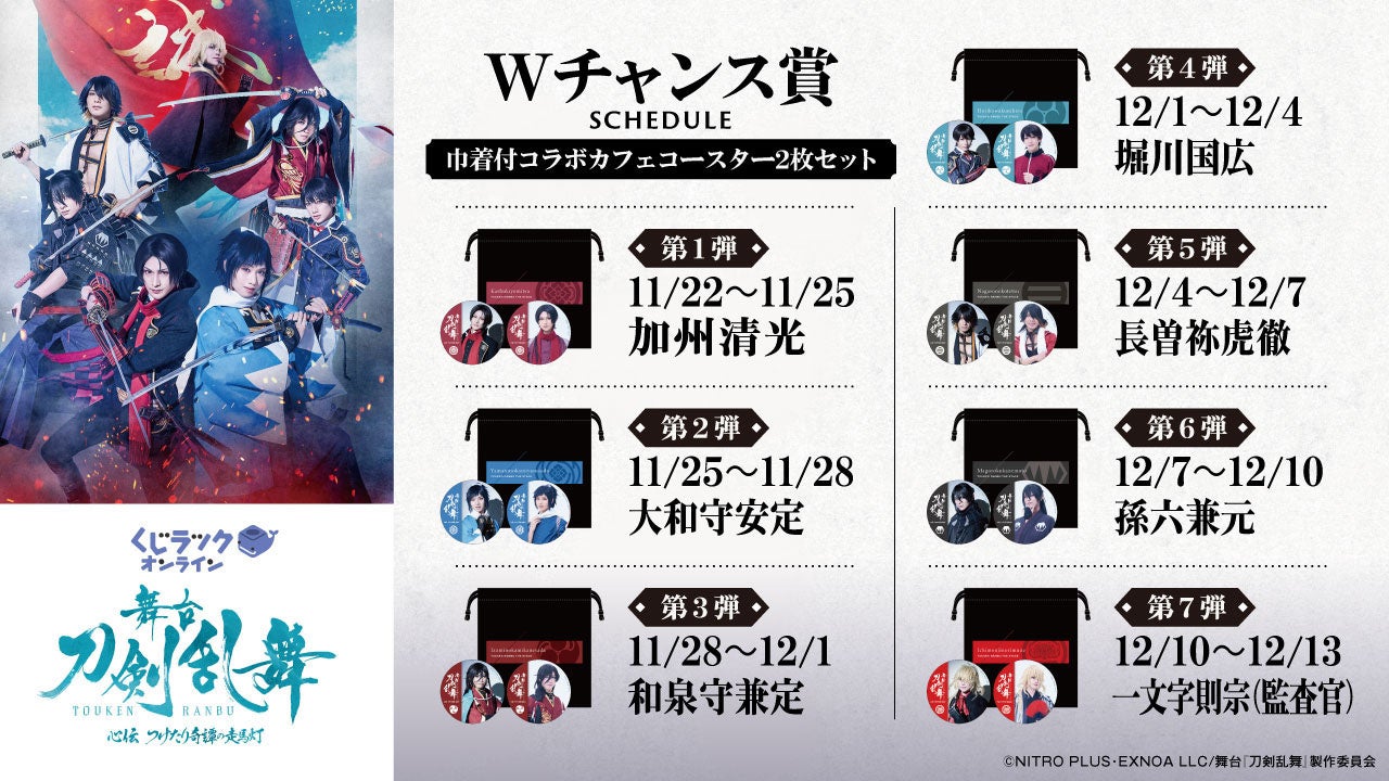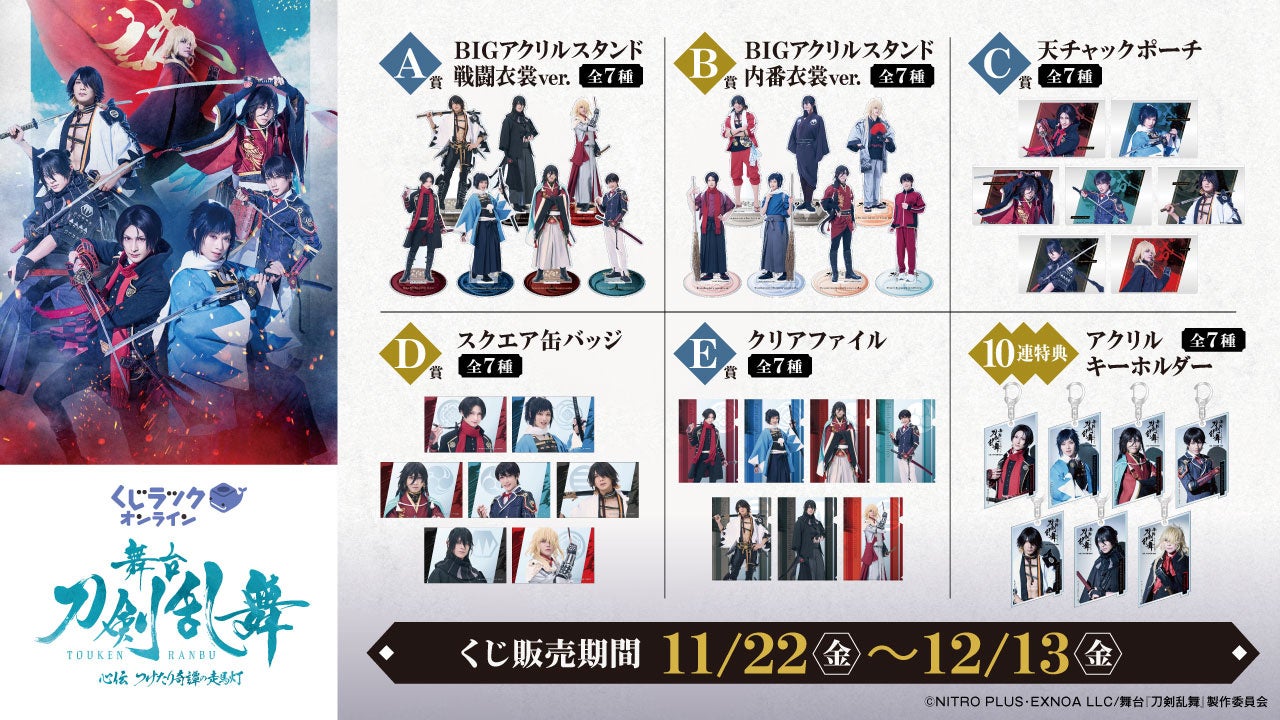 カルチュア・エンタテインメント株式会社は、Blu-ray/DVDの発売を記念して舞台『刀剣乱舞』心伝 つけたり奇譚の走馬灯とコラボレーションした、ハズレ無しでオリジナルグッズがゲットできるオンラインくじ「くじラックオンライン」を2024年11月22日(金)より販売いたします。賞品は新規ビジュアルを含むA賞~E賞まで、さらに、くじ1枚ご購入ごとにWチャンス賞の抽選が行われ、当選した方は特別な賞品が獲得できます。