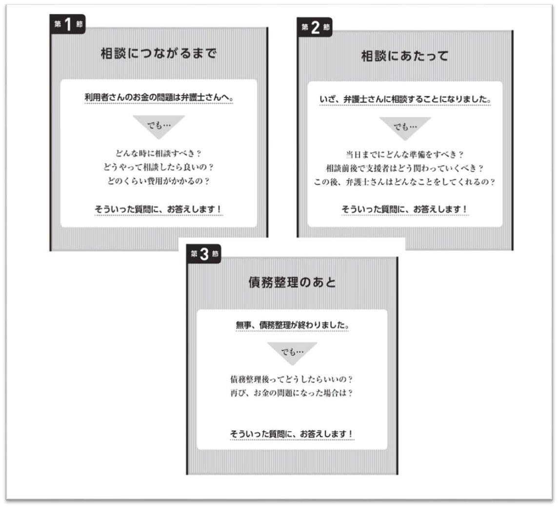 利用者の債務問題は弁護士との連携が必要なケースが多いため、ケアマネジャーとしてどう動けばいいのか、前後の関わり方がわかる。