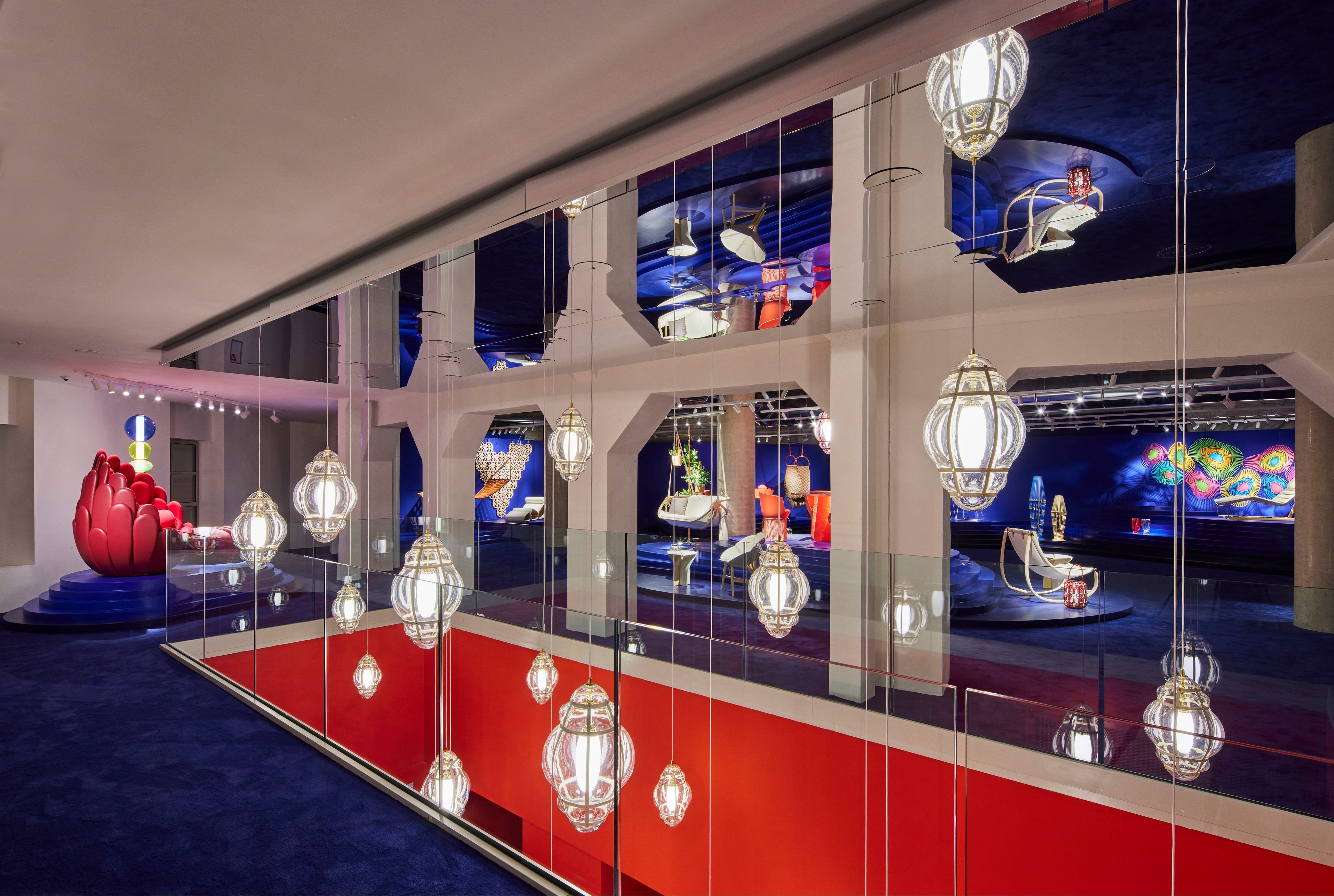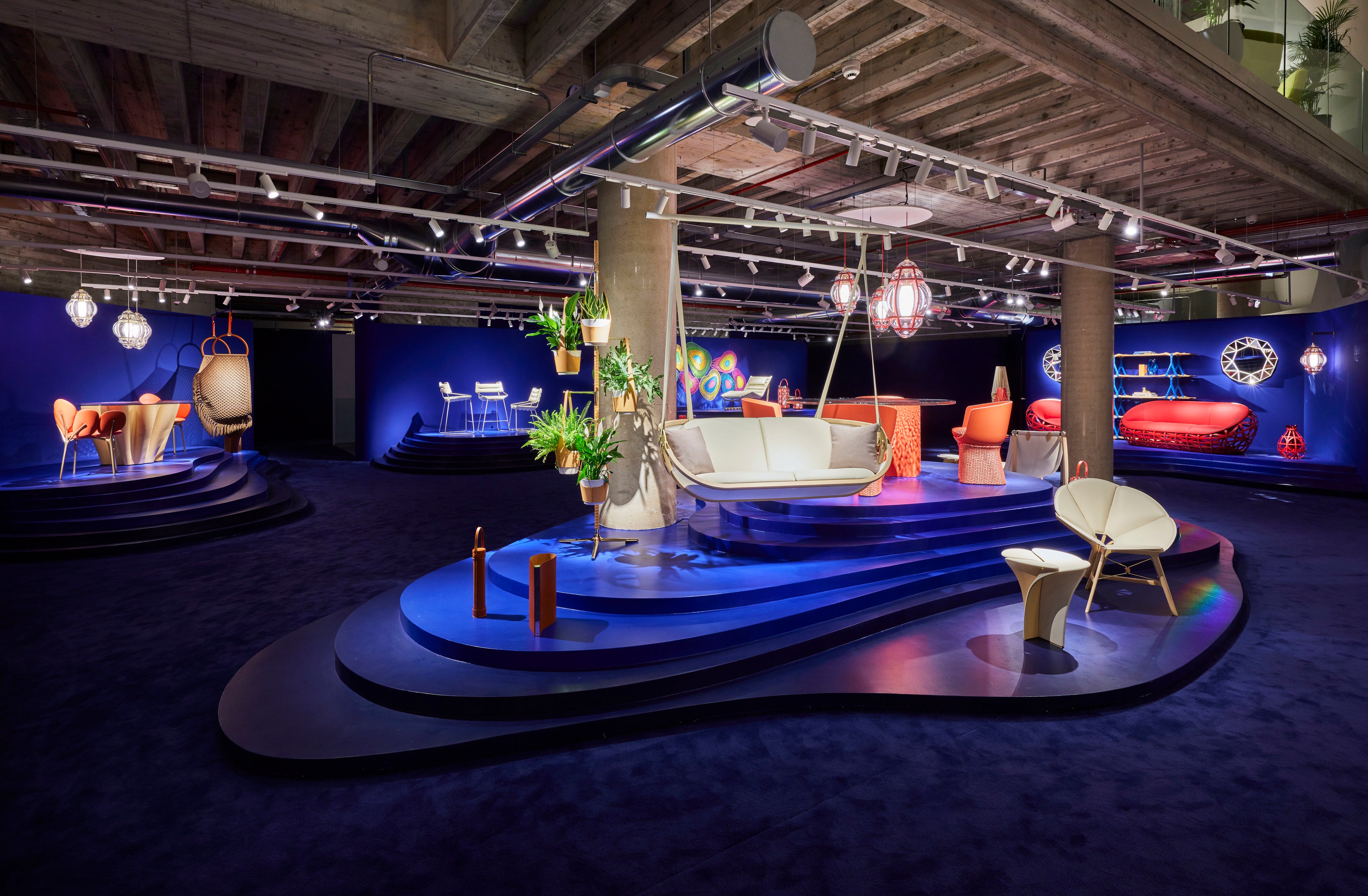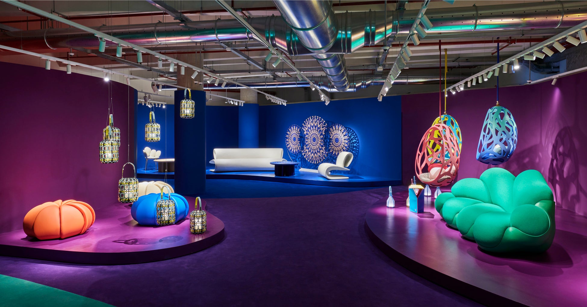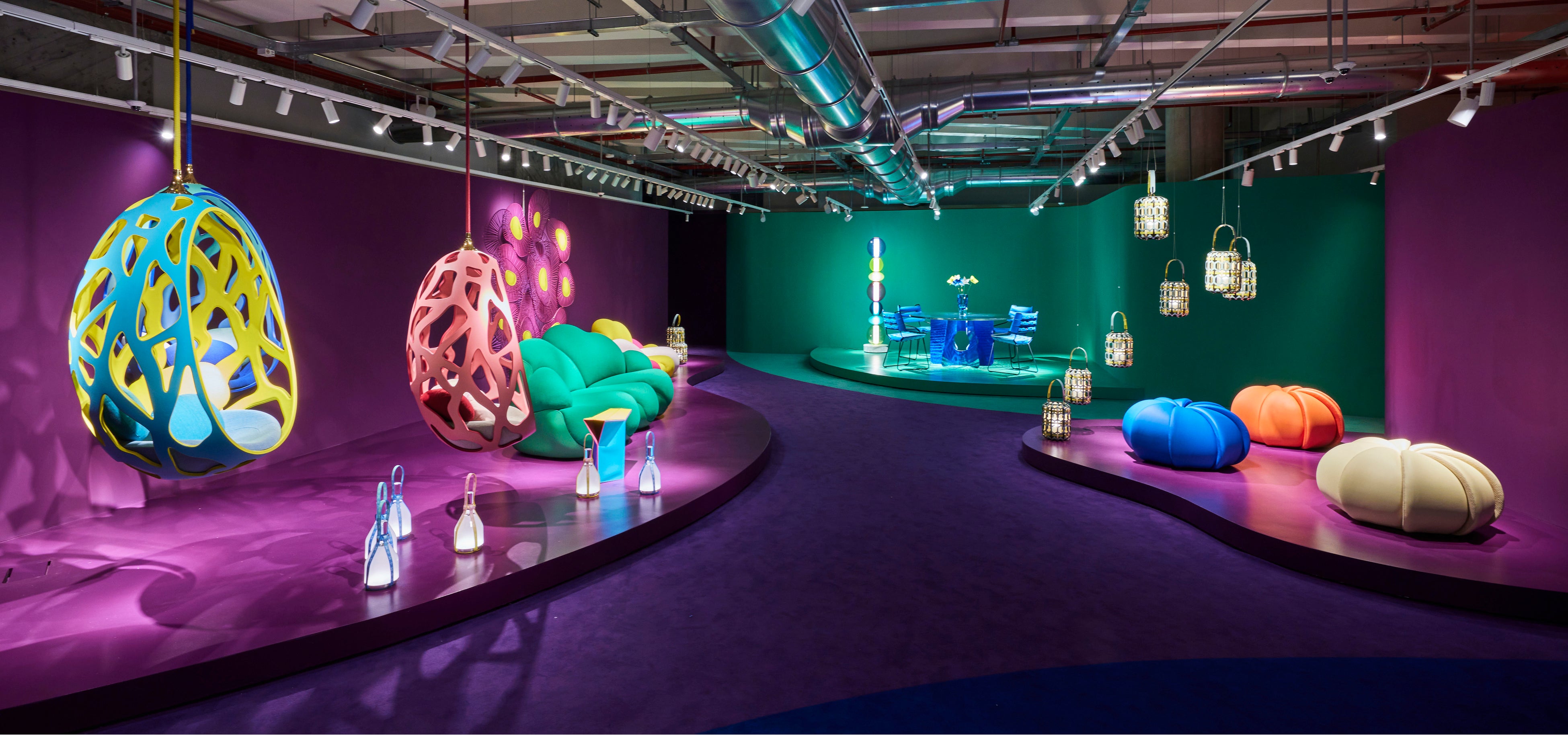 会場入口には、トロピカルフラワーを想わせるデザインが座る人を優しく包み込むカンパーナ兄弟の「ブルボ」が登場。「ベル・ランプ」の様々なバージョン違いも登場し、来場者を場内へと誘います。