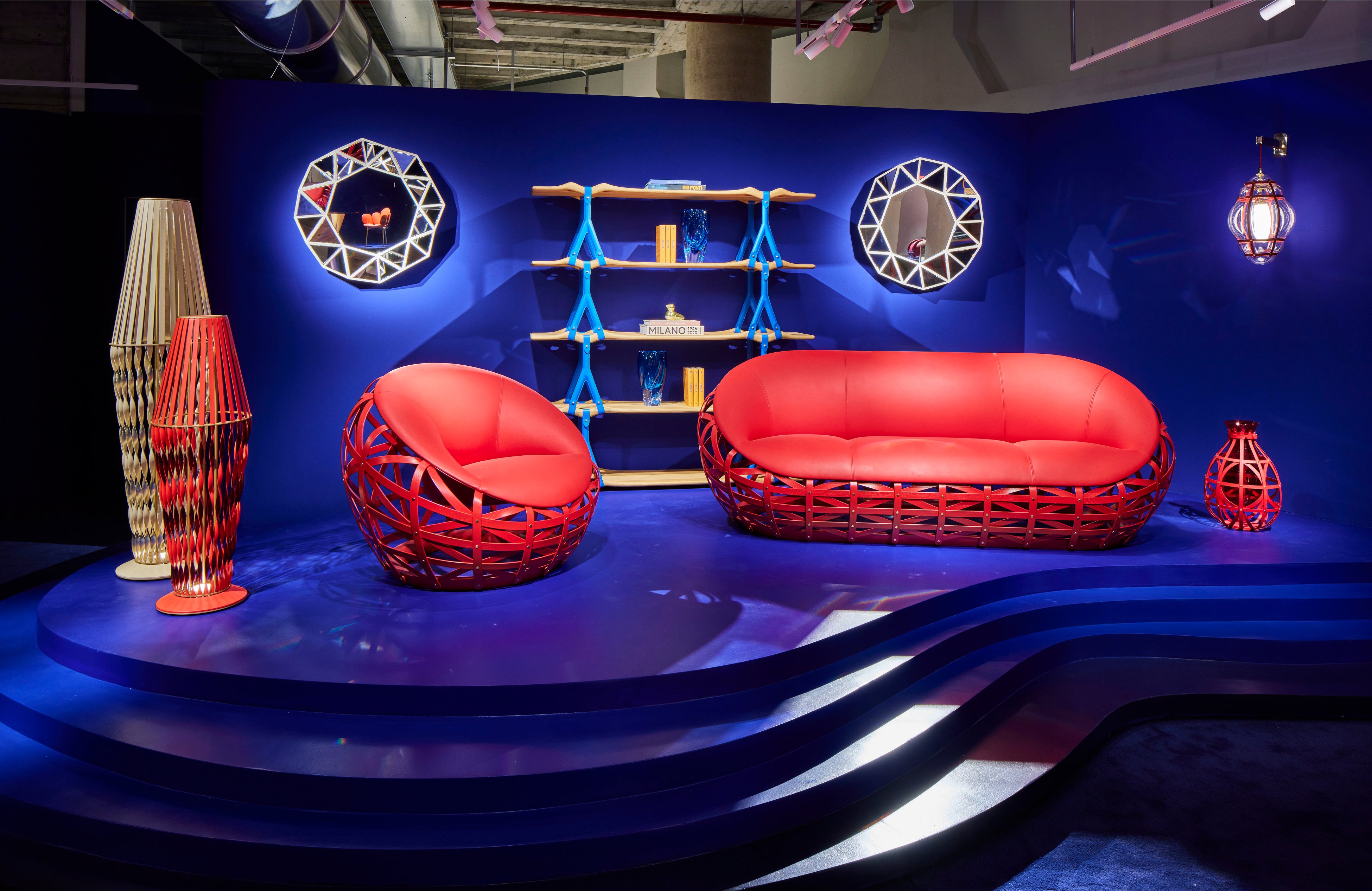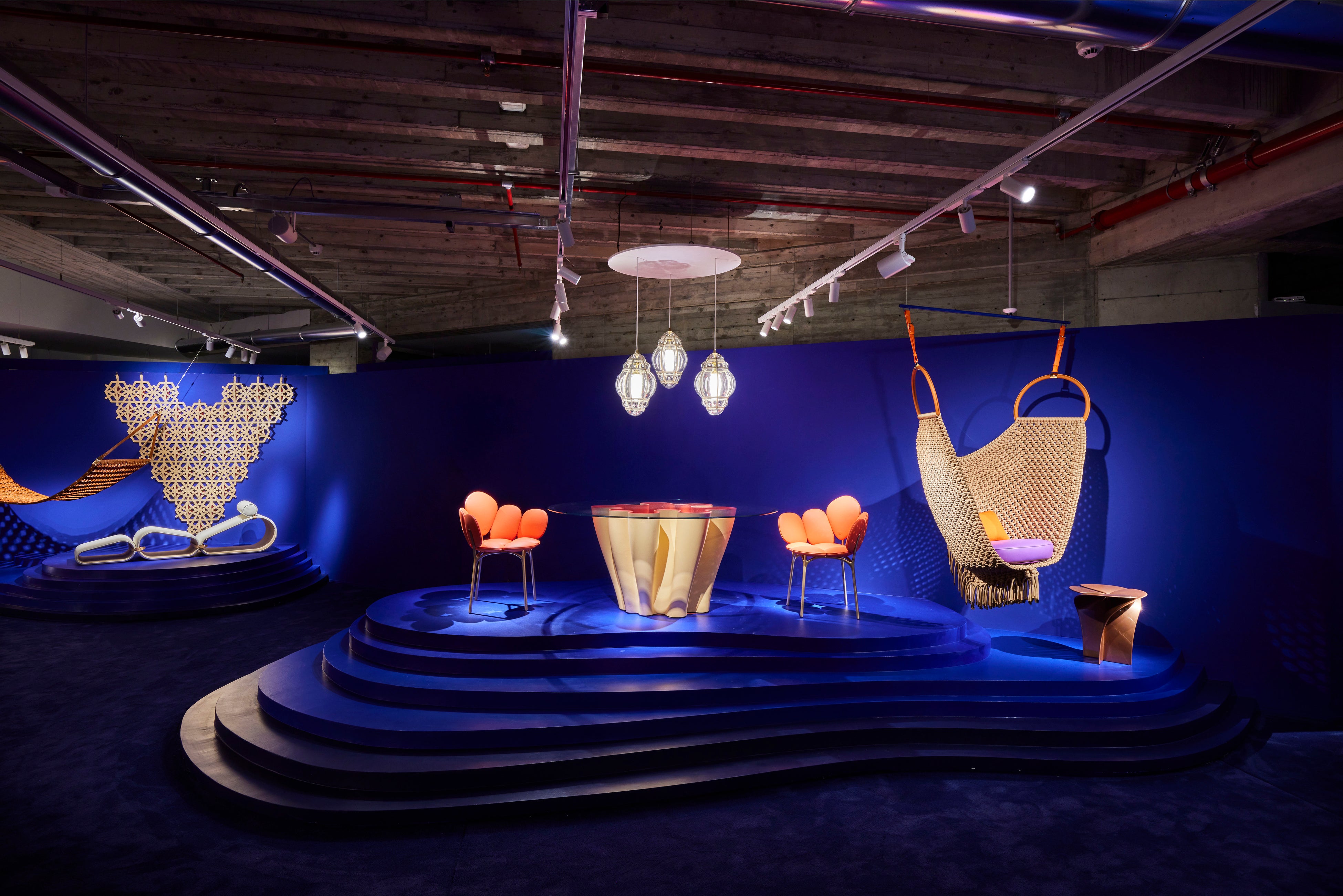 会場内は、ネイビーやパープルを基調とした空間に、色とりどりの「オブジェ・ノマド コレクション」が勢揃い。こちらのエリアには、カンパーナ兄弟が手がけ、ブラジルの結婚式や子供たちのパーティで出されるお菓子の名前を冠したソファ「ボンボカ」の新バージョンの他、昨年発表されたカンパーナ兄弟によるプーフ「メレンゲ」や、ザネラート/ボルトットが手掛けた「ランタン」、フランク・チョウがデザインを手掛け、中国・雲南省の棚田の重なりと、アリゾナ州アンテロープ・キャニオンの自然が造り出したフォルムからインスピレーションを得たアームチェア&ソファ「シグネチャー」などが揃います。