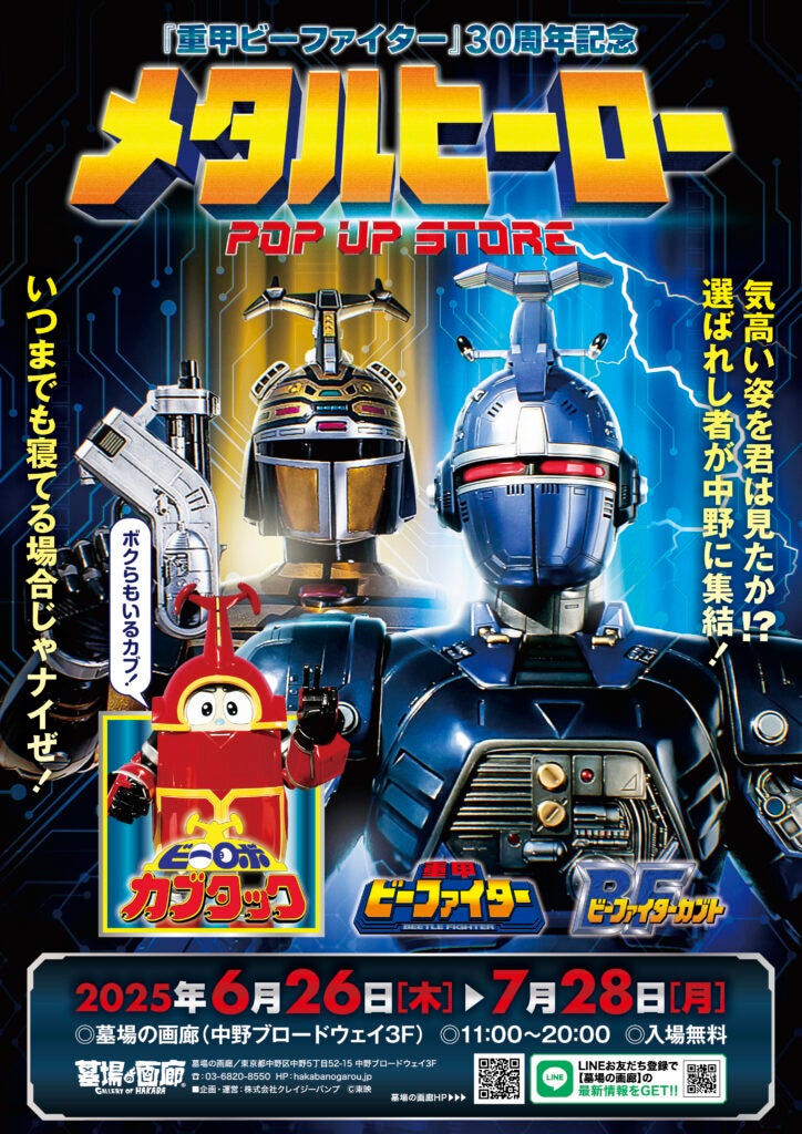 マンガ、アニメ、特撮などを始めとするサブカルチャーをテーマとした企画展を開催・運営している株式会社クレイジーバンプは2025年6月26日(木)~2025年7月28日(月)の期間で墓場の画廊中野店と墓場の画廊ONLINE STOREにて開催する【重甲ビーファイター30周年記念 メタルヒーローPOP UP STORE】の商品情報を公開致します。