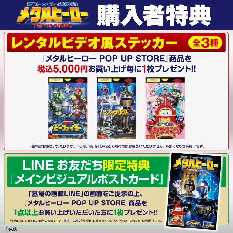 ※イベント開催期間中、店頭またはONLINE STOREで「メタルヒーローシリーズ関連商品(一部除く)」のご購入5,000円(税込)毎に1枚、「レンタルビデオ風ステッカー」をプレゼント。(無くなり次第終了)