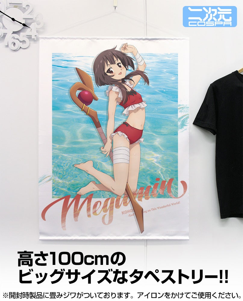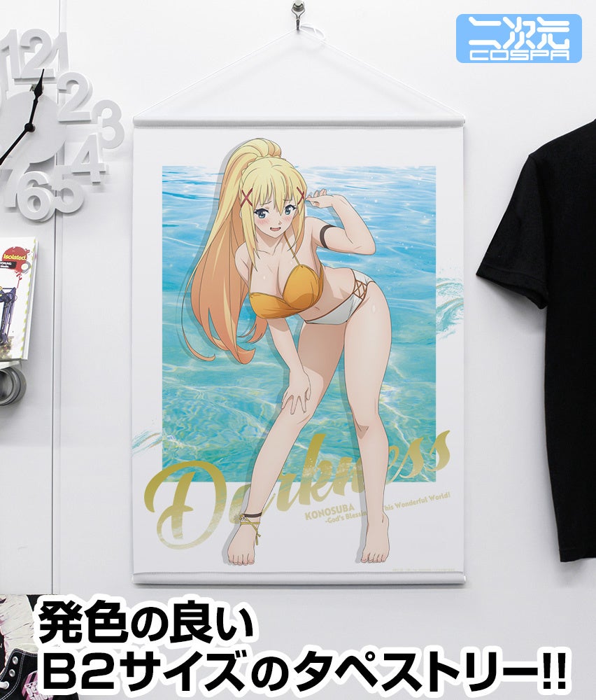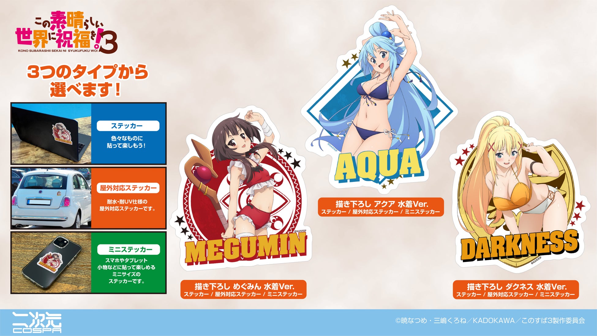 描き下ろしイラストを使用した水着姿「アクア」「めぐみん」「ダクネス」のタペストリー、ステッカーが二次元コスパから登場。