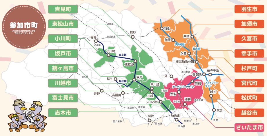 東武鉄道沿線 17 市町:さいたま市、川越市、加須市、東松山市、羽生市、 越谷市、志木市、久喜市、富士見市、坂戸市、 幸手市、鶴ヶ島市、小川町、吉見町、宮代町、 杉戸町、松伏町
