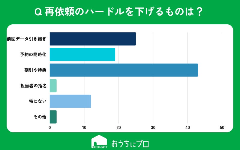 再依頼のハードルを下げる要素は「割引や特典」「前回のデータの引き継ぎ」。