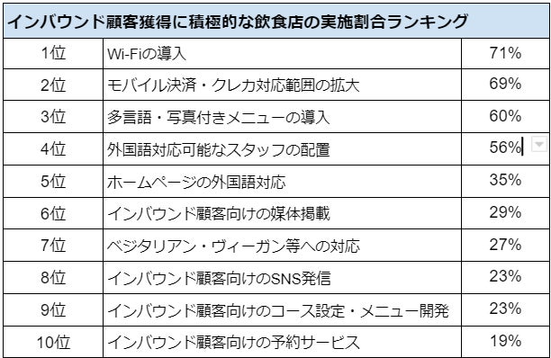 まず、すでに取り組んでいるインバウンド受け入れ対策について尋ねたところ、1位は「Wi-Fiの導入」。これはインバウンドに限らず顧客サービス向上の対策とも言えますが、71%が実施していました。続いて決済方法の導入が2位。これもコロナ禍でさらに後押しされた印象もあります。