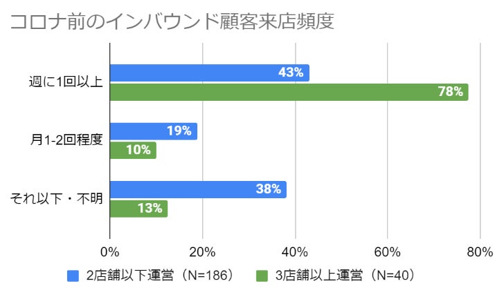 まず前提として、アンケート対象店舗のコロナ前におけるインバウンド顧客来店頻度を尋ねたところ、2店舗以下を運営する飲食店は、週1回以上が43%、3店舗以上を運営する飲食店では78%と比較的高い頻度であることがわかりました。