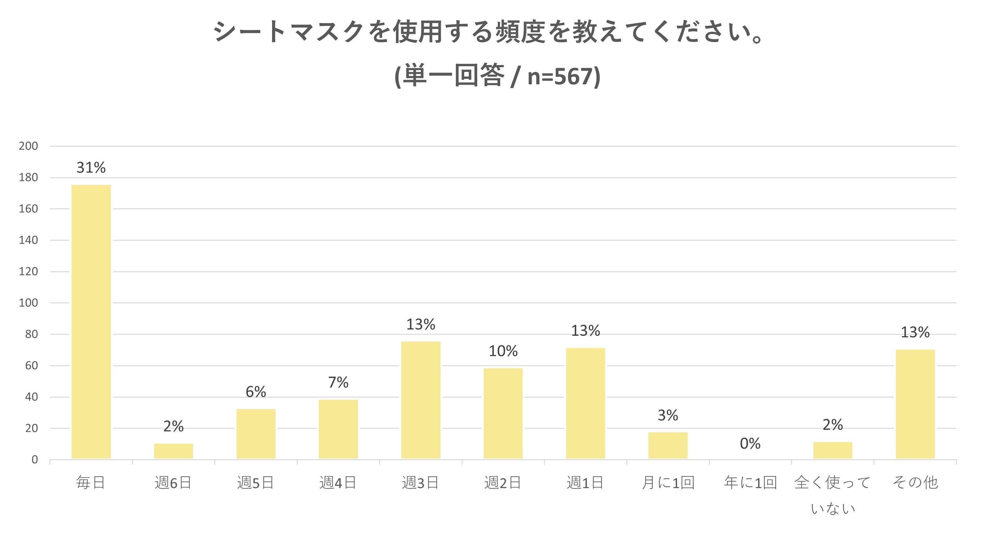 シートマスクの使用頻度をお伺いしたところ「毎日」と回答された方は全体の31%。約3人に1人が毎日シートマスクを使用していることが分かりました。