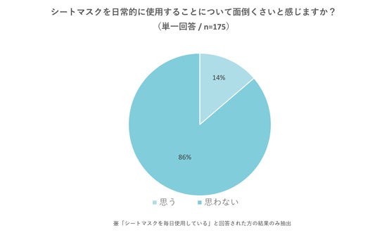 また、シートマスクを日常的に使用することについて毎日シートマスクを使用する方の86%が「面倒くさいと思わない」と回答。