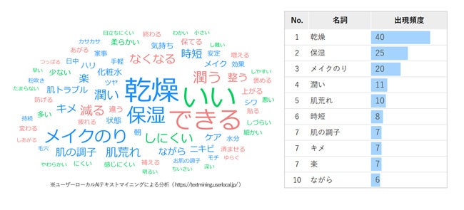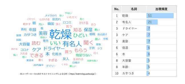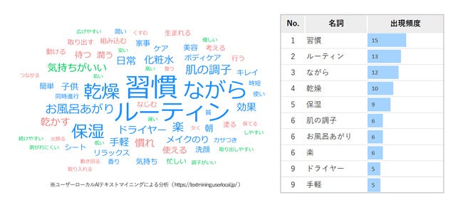 さらに、一見スキンケアとは関係がなさそうな『ドライヤー』も頻出し、『美容』や『ケア』の件数と並ぶ結果に。ドライヤー中のお肌の乾燥防止や、時間の有効活用するため、というのがその理由でした。