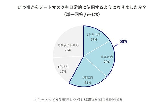 また、毎日シートマスクをすると回答された方のうち58%の方が1年以内にシートマスクを日常的に使用するようになったと回答。その中でも、半年以内に使用するようになったと回答された方は37%。