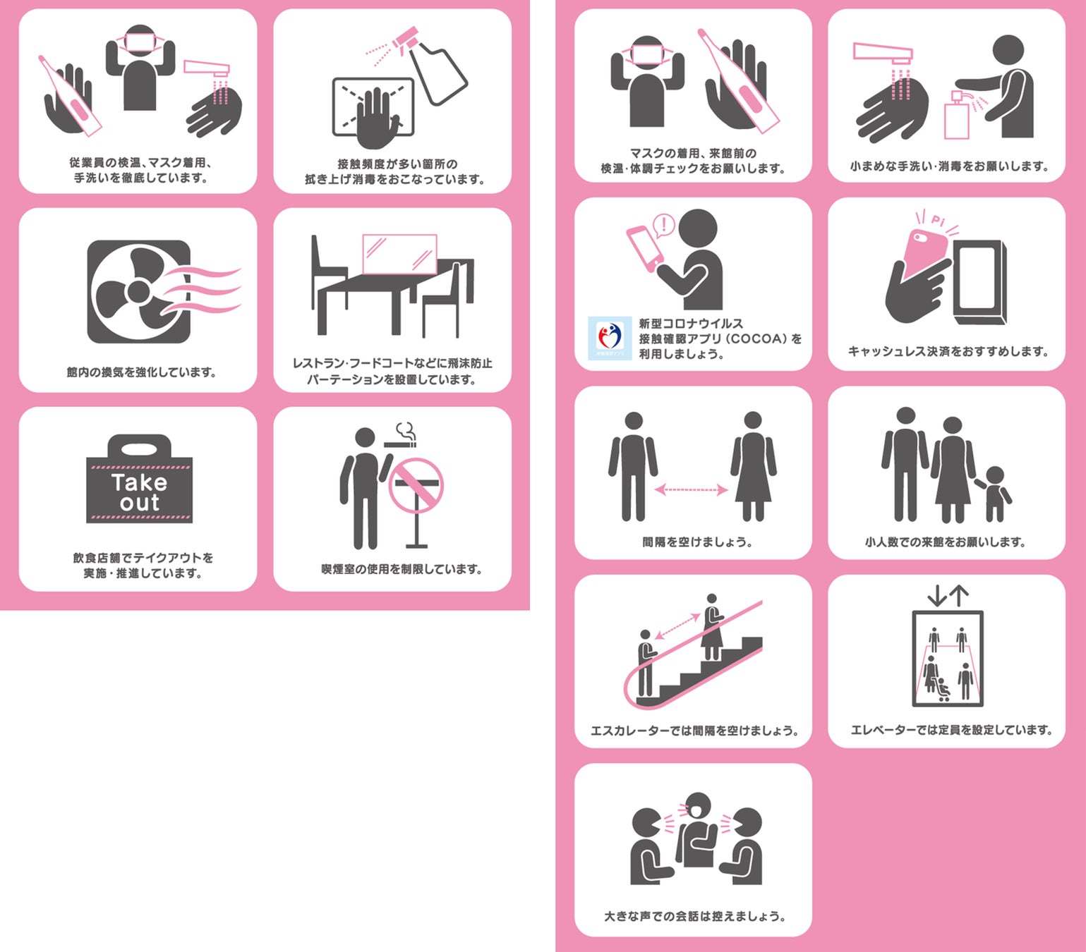 当施設では、ご来館のお客様に安心してお買物・お食事をお楽しみいただくため、新型コロナウイルス感染拡大防止のため様々な取り組みを実施しております。なお、政府の協力要請などにより、営業時間・駐車場利用時間・営業内容につきましては急遽変更させていただく可能性がございます。ご来館の際には施設ウェブサイトの「お知らせ」ページから最新の営業時間をご確認のうえお越しください。お客様にはご迷惑をおかけしますが、何卒ご理解賜りますようお願い申しあげます。ご来館の際はお住まいの都道府県の移動に関する最新の方針をご確認ください。