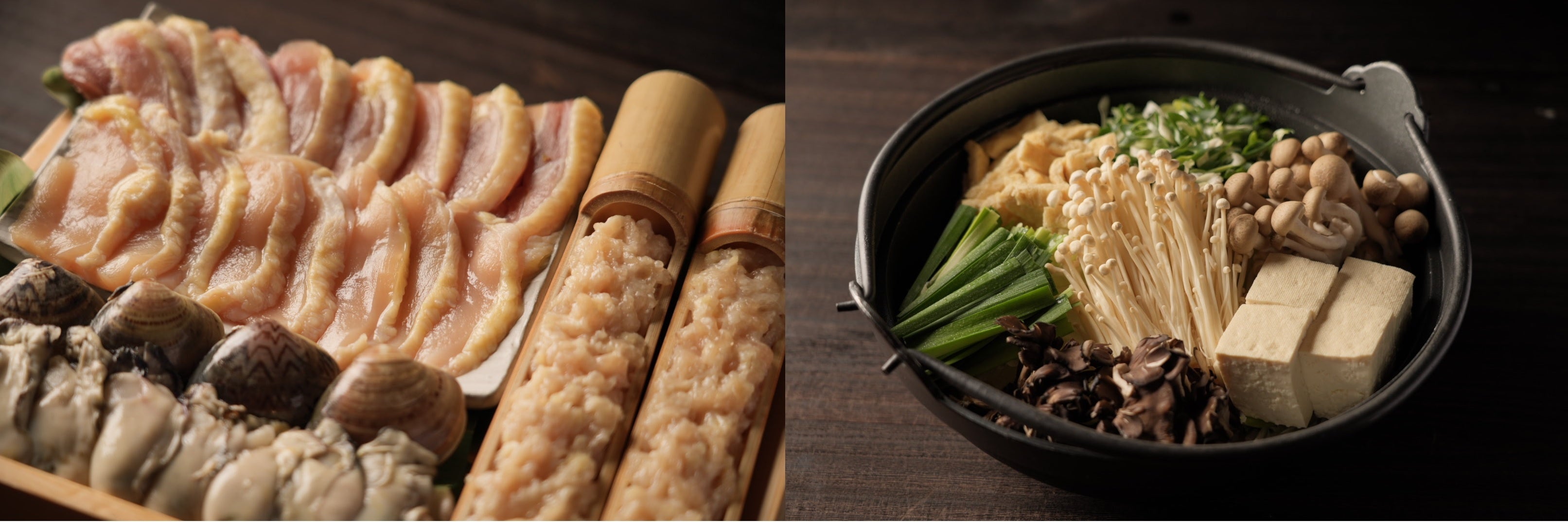 よく運動しのびのび育つ長期に亘る飼育によって強い旨味を楽しめる自慢の地鶏をメインに、炊くほどうまみが増していく貝類やきのこ類で、複雑な味わいの鍋に仕上がります。隠し味は鶏油(チーユ)。