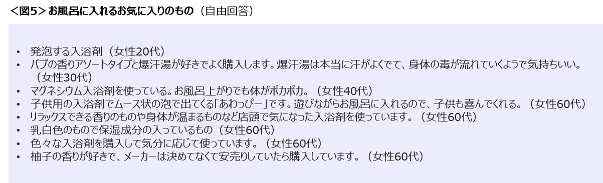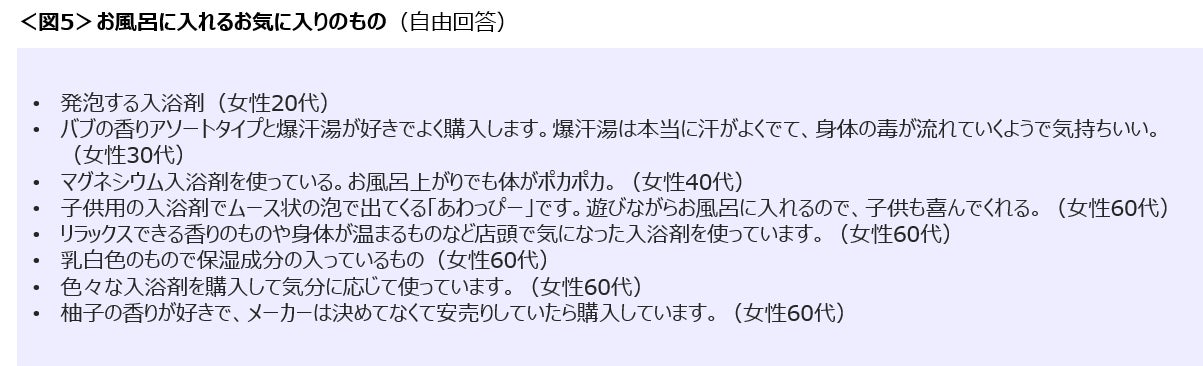 お風呂に入れるお気に入りのものとして、「香りのよい入浴剤」「身体が温まる入浴剤」などがあげられた。<図5>