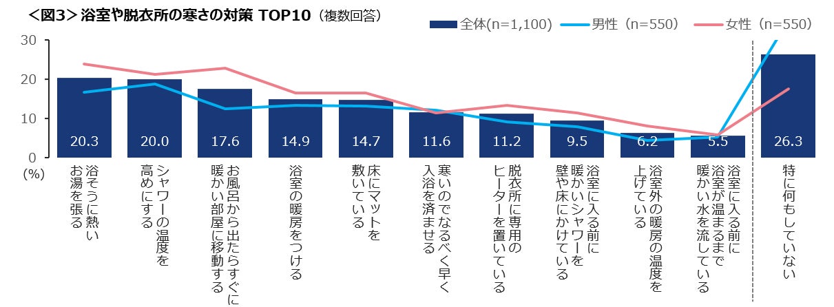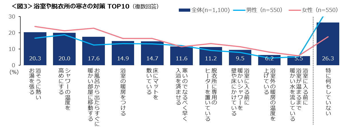 女性の方が寒さ対策をしているものの、「浴室の暖房をつける」「脱衣所に専用ヒーターを置く」といった浴室外での暖房対策をしている割合は2割に満たない。<図3>