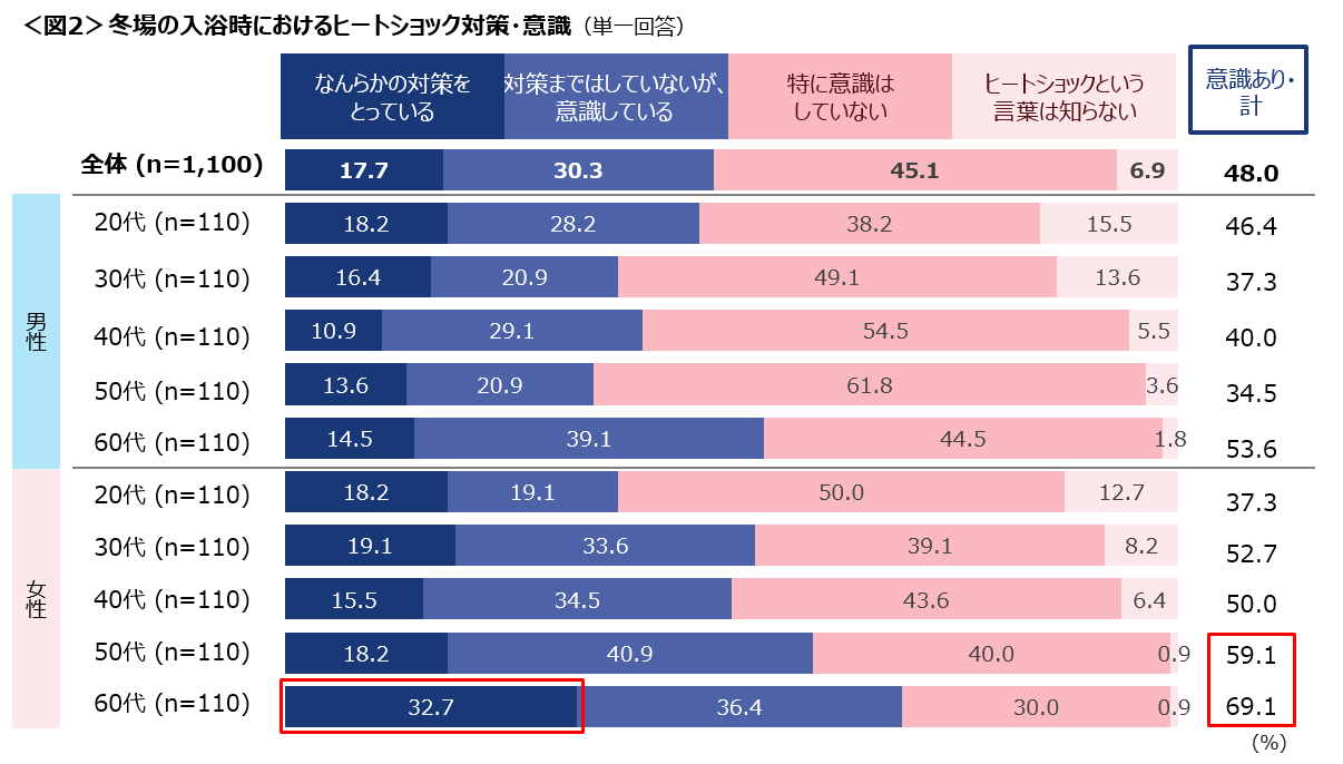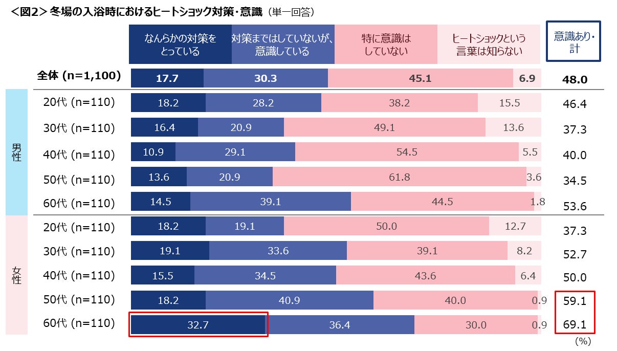 ヒートショックに対して「意識している」は約半数だが、「なんらかの対策をしている」は17.7%にとどまる。