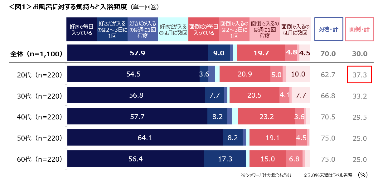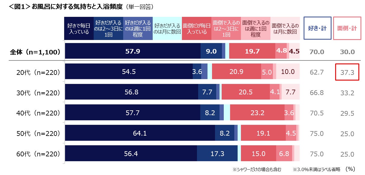 年代が上がるにつれお風呂が好きな傾向。一方で、20代は「面倒」に感じている割合が37.3%と他の年代と比べ高い。<図1>