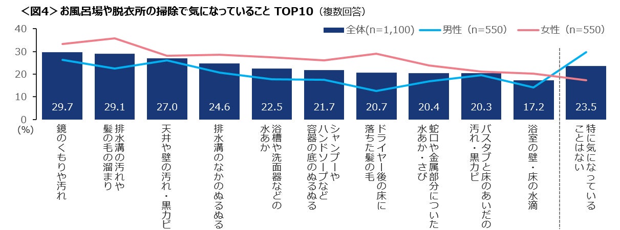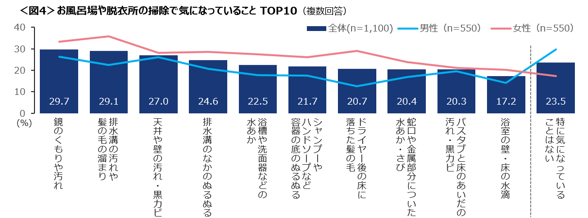 お風呂場や脱衣所の掃除で気になっていることは「鏡のくもりや汚れ」「排水溝の汚れや髪の毛の溜まり」。