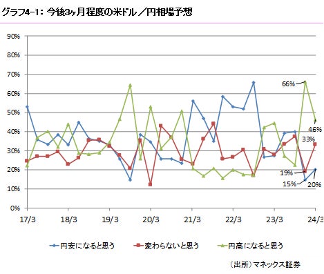 【円高になると思う】(2023年12月)66% →(2024年3月)46%(前回比-20%)