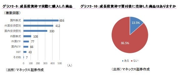 成長投資枠で実際に購入した商品としては国内株式が最も多く、外国投資信託、国内投資信託が続く結果となりました。また、「成長投資枠で買い付けた商品を既に売却した」という回答は1割を超えていました。