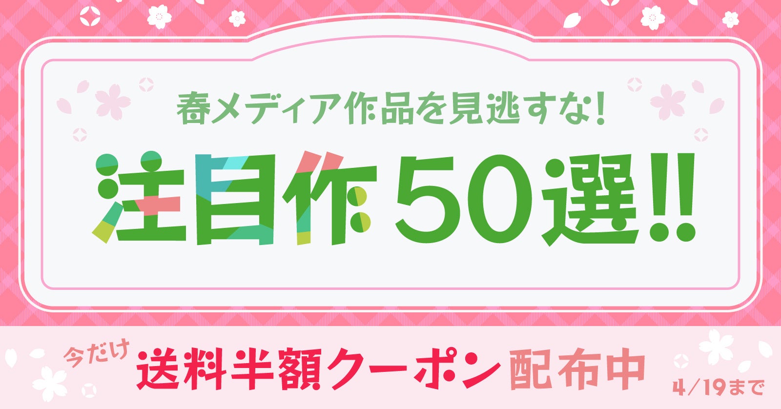 漫画全巻ドットコム本店では、春のメディア化漫画含む注目作50選をご紹介!さらに、期間限定で送料半額クーポンを配布しております!!!!!